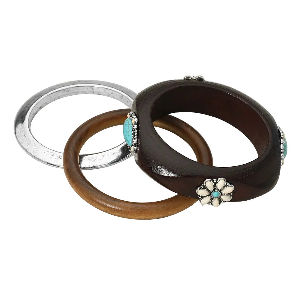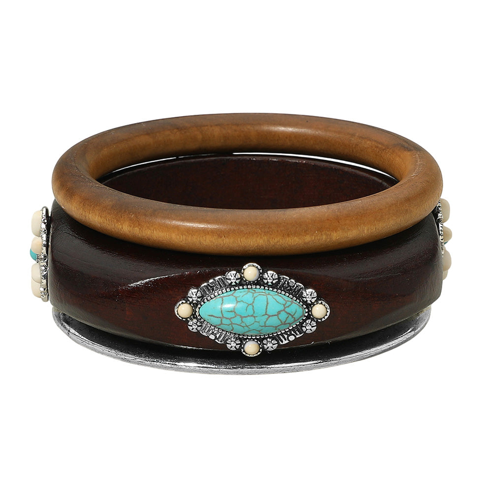 A western-inspired bangle set featuring wooden bangles accented with oval turquoise stones. Designed for stacking or wearing individually, this multi-layered set adds natural texture and a bold statement touch to casual and boho-inspired looks.