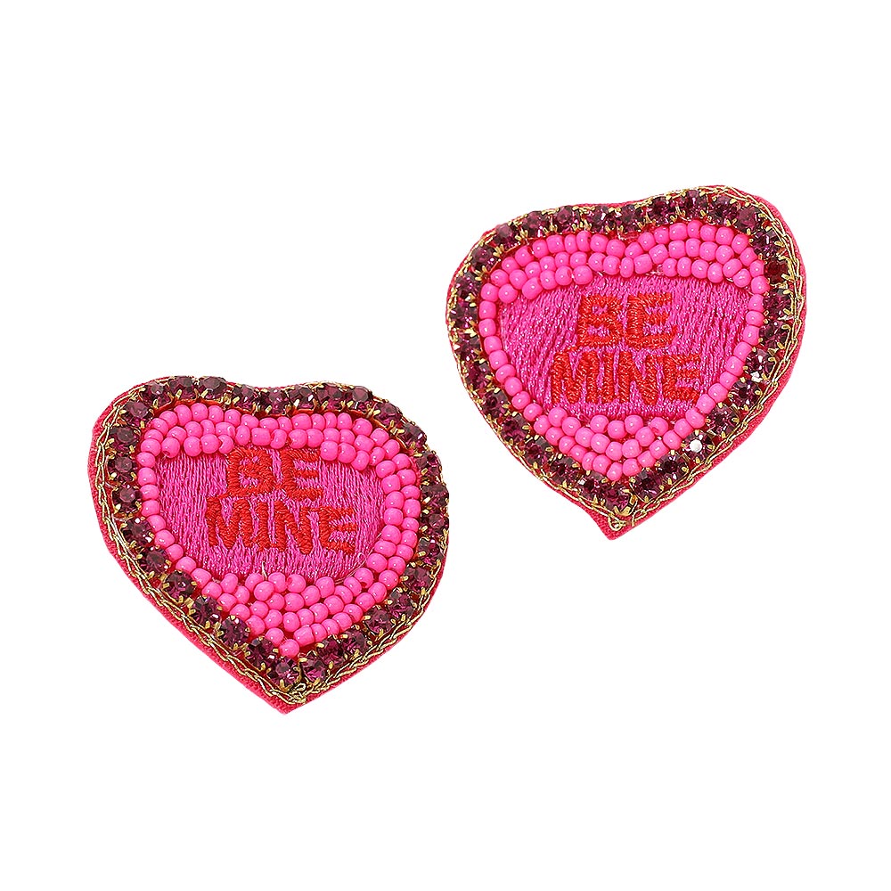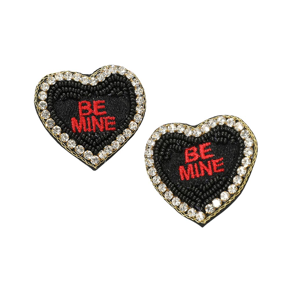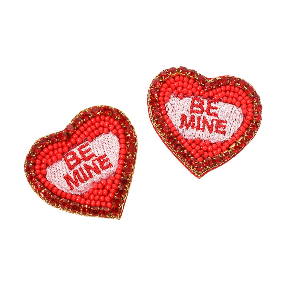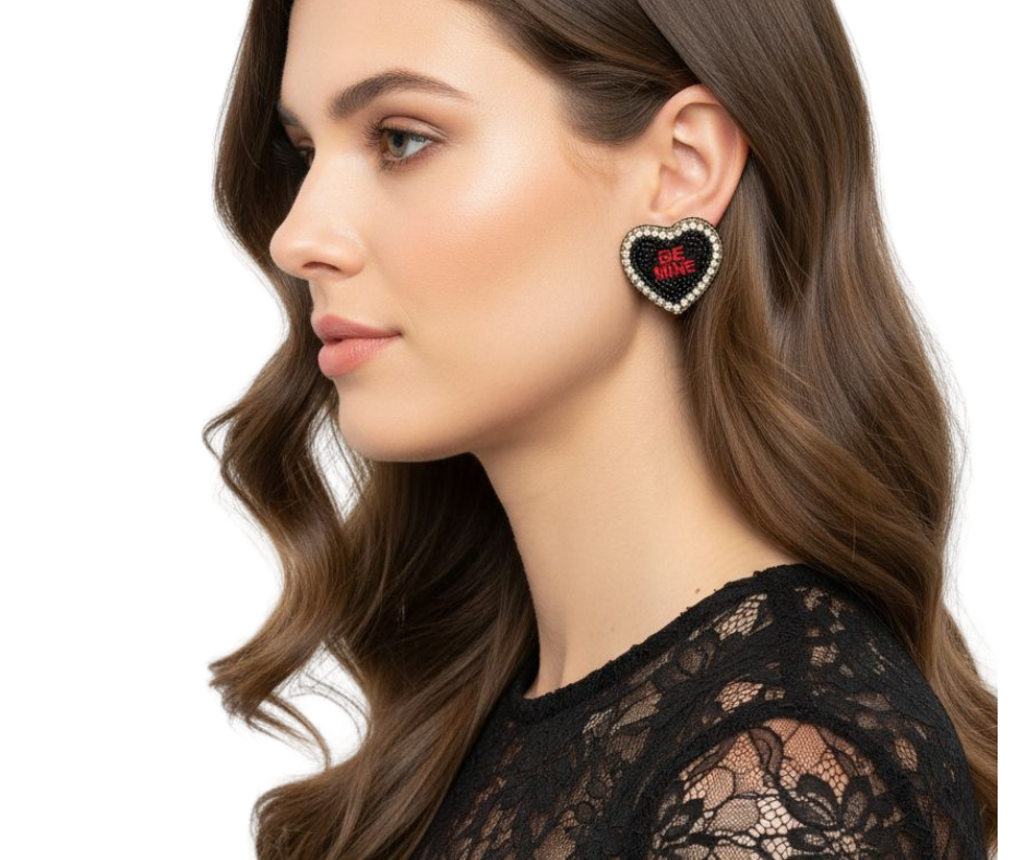 Embroidered seed bead earrings featuring a BE MINE message with stone embellishments for added detail. Lightweight with a statement look, perfect for Valentine’s Day, date nights, or gifting. Designed to stand out while remaining easy to wear.