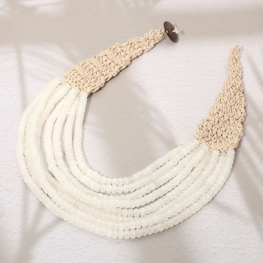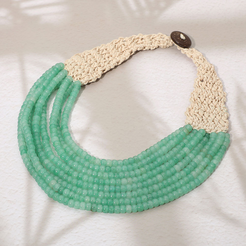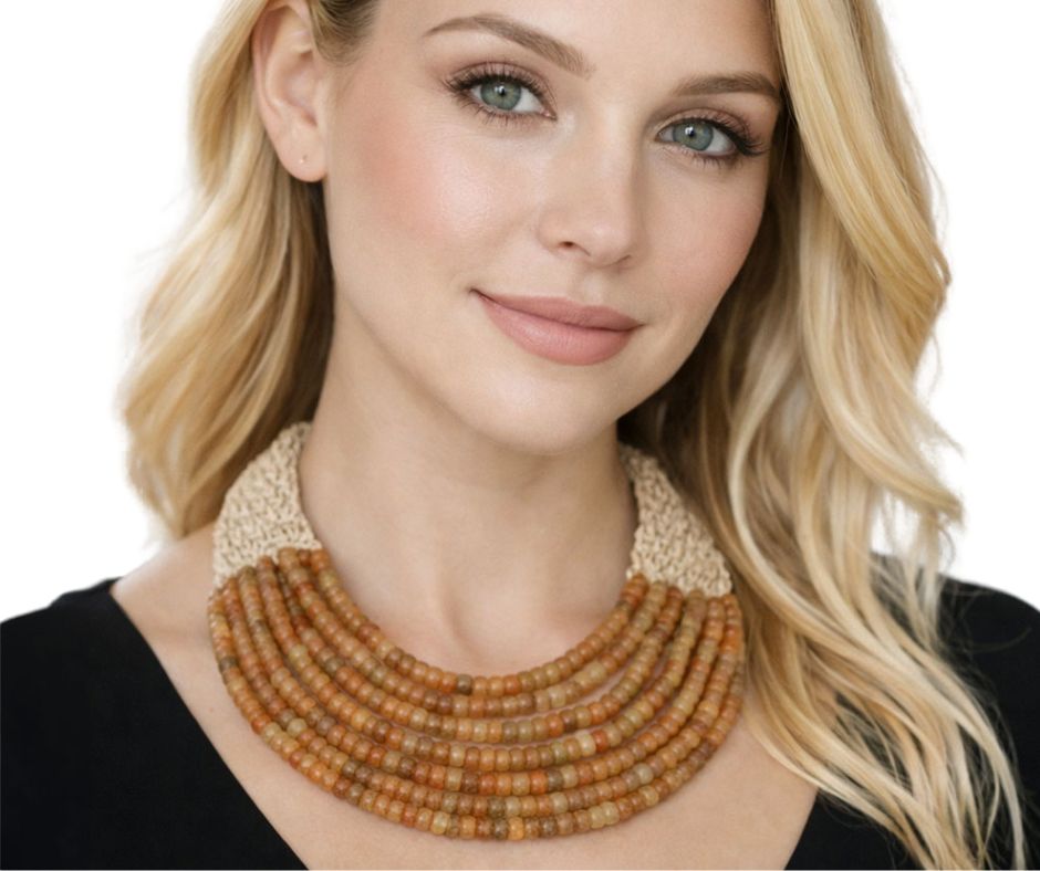 A bold collar-style necklace featuring multiple strands of beads for added texture and dimension. Designed to sit comfortably at the neckline, it makes a striking statement while remaining lightweight and easy to wear.