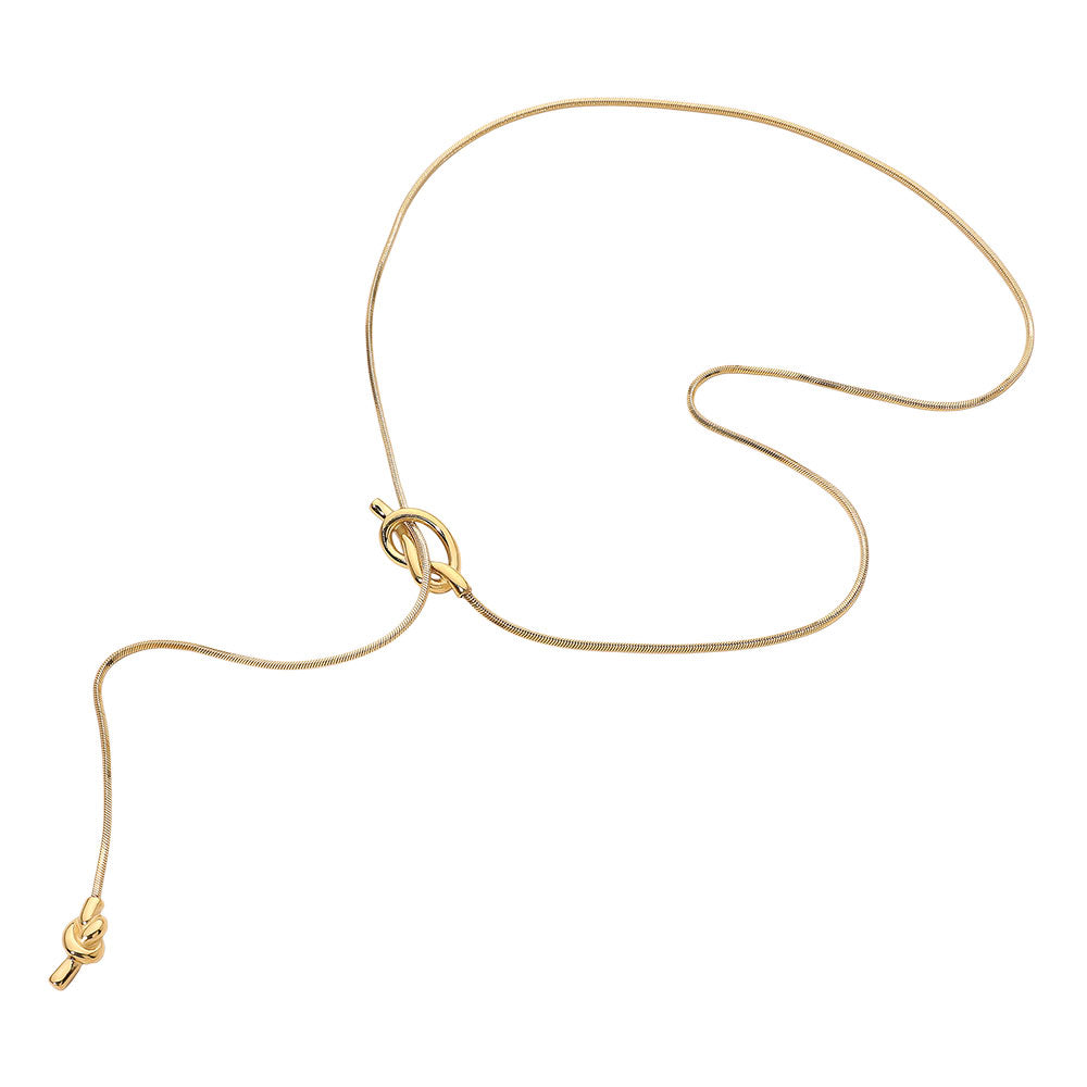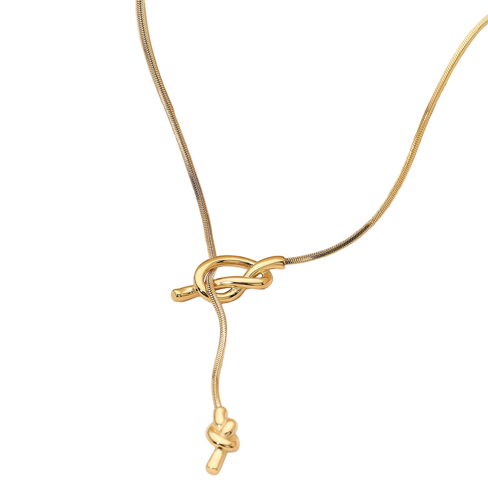 This sleek lariat necklace features a polished stainless steel design with a simple knotted detail that adds a modern, elegant touch. The adjustable slider allows you to customize the drop length for the perfect fit, making it easy to style with a variety of necklines. Durable, tarnish-resistant, and versatile—an effortless piece for everyday wear.
