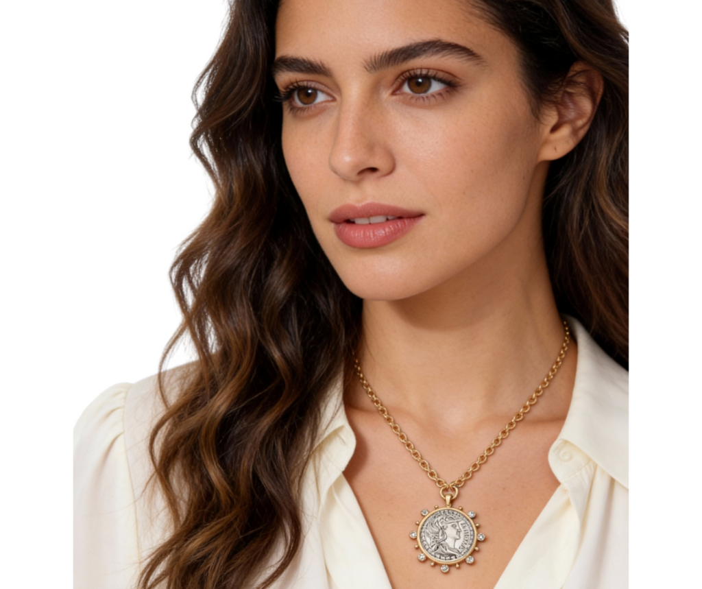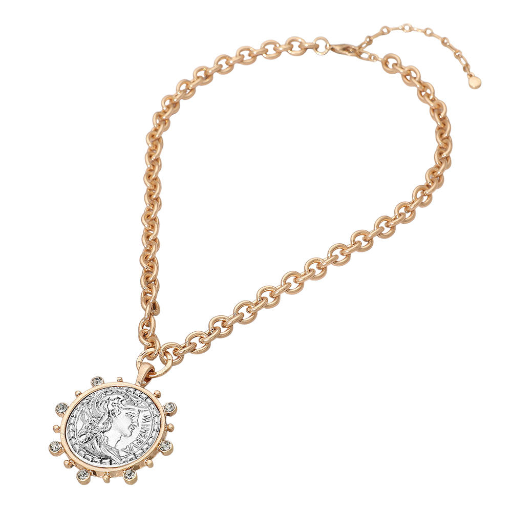 This eye-catching necklace features a two-tone design with a sparkling rhinestone bubble frame surrounding a sleek coin pendant. Finished in rose gold for a soft, stylish shine, it’s a standout piece that adds a polished touch to any outfit.