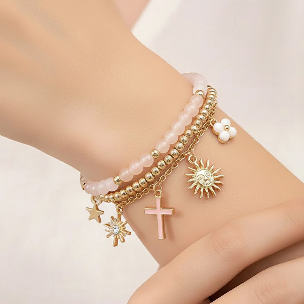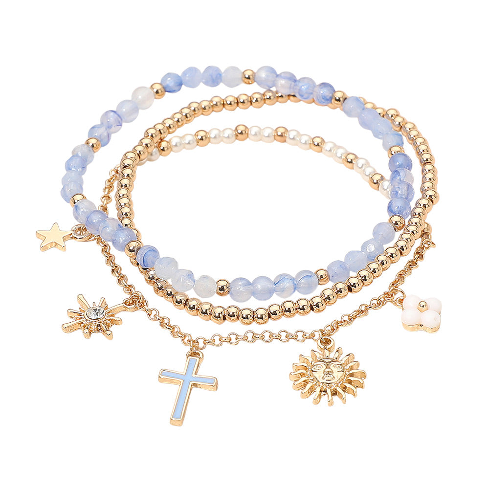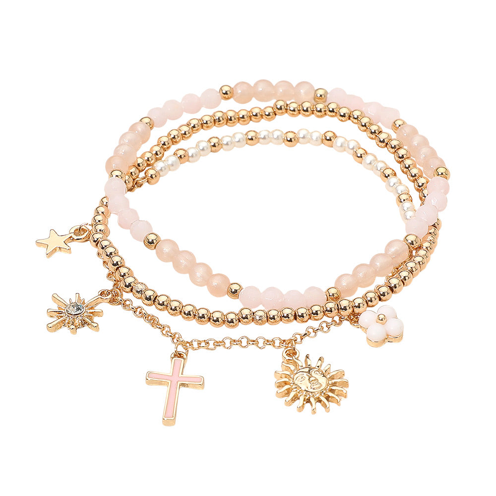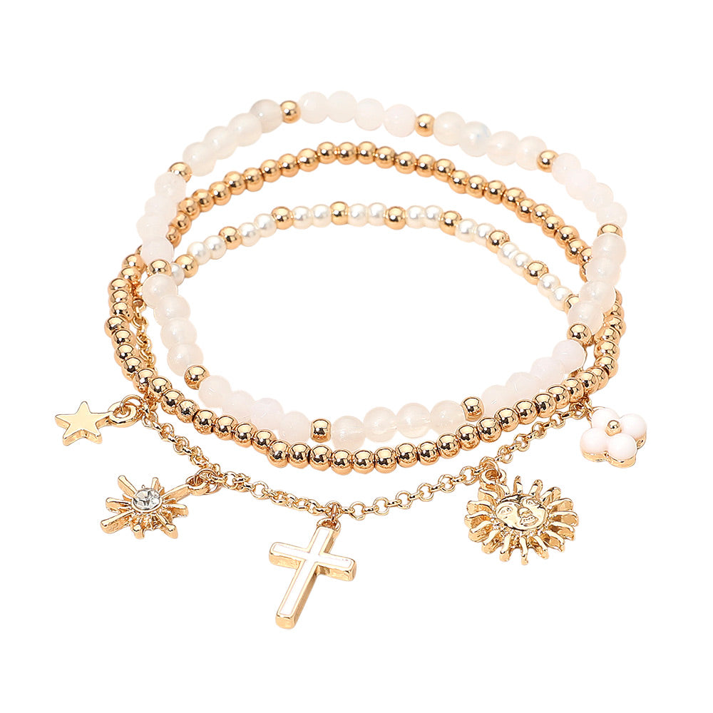 A pretty 3-piece bracelet set featuring pearl beads, metal ball accents, faceted beads, and mixed charms including a cross, flower, star, and sunburst. Designed on stretchy bands for easy wear and layering.