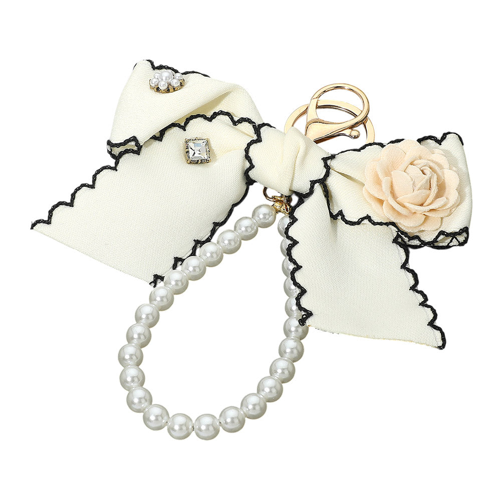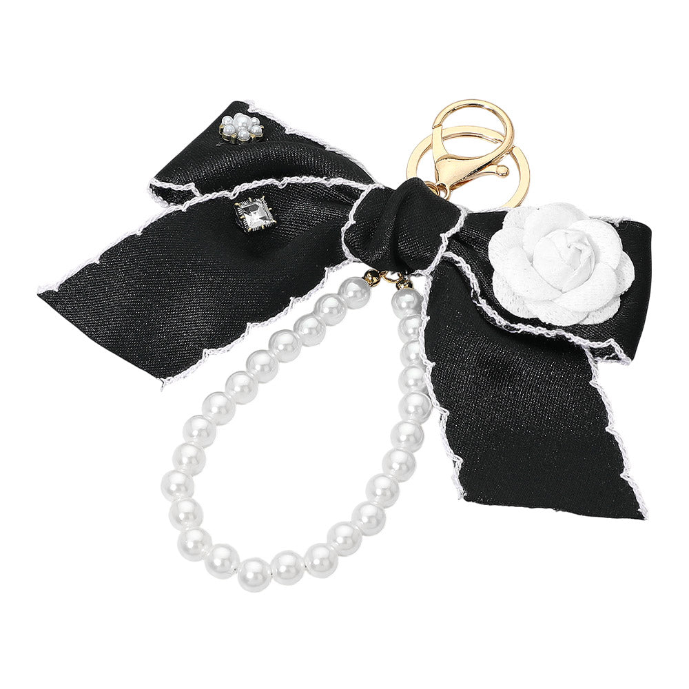 Flower rhinestone accent pearl loop bow keychain bag charm. Features floral details with sparkling rhinestones, pearl accents, and a delicate bow design. A charming accessory to add a playful touch to keys, handbags, or totes.