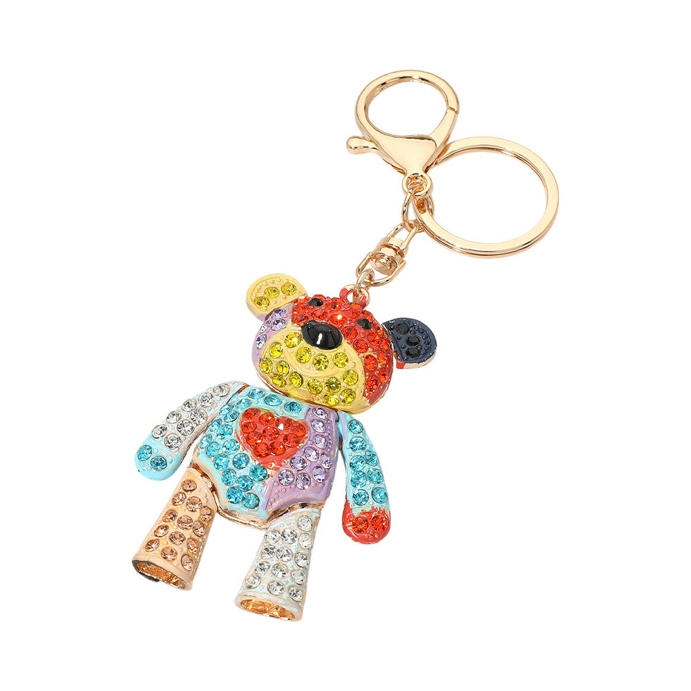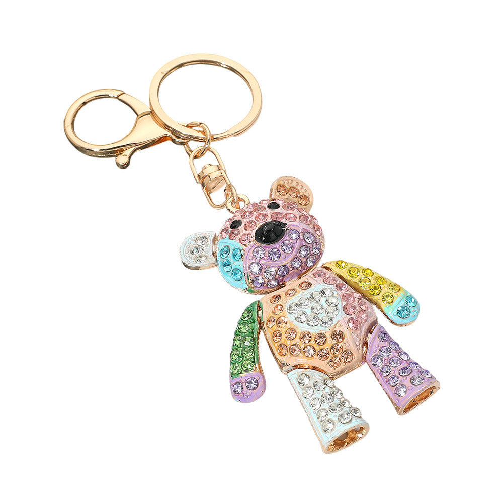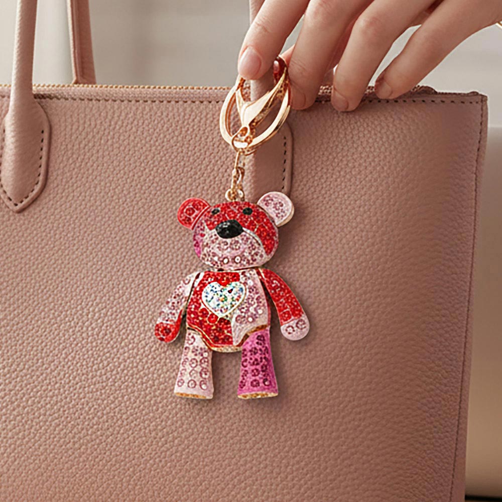 Rhinestone embellished teddy bear keychain bag charm. Designed with sparkling rhinestone details for a cute and eye-catching look. A fun accessory to clip onto keys, handbags, or backpacks.