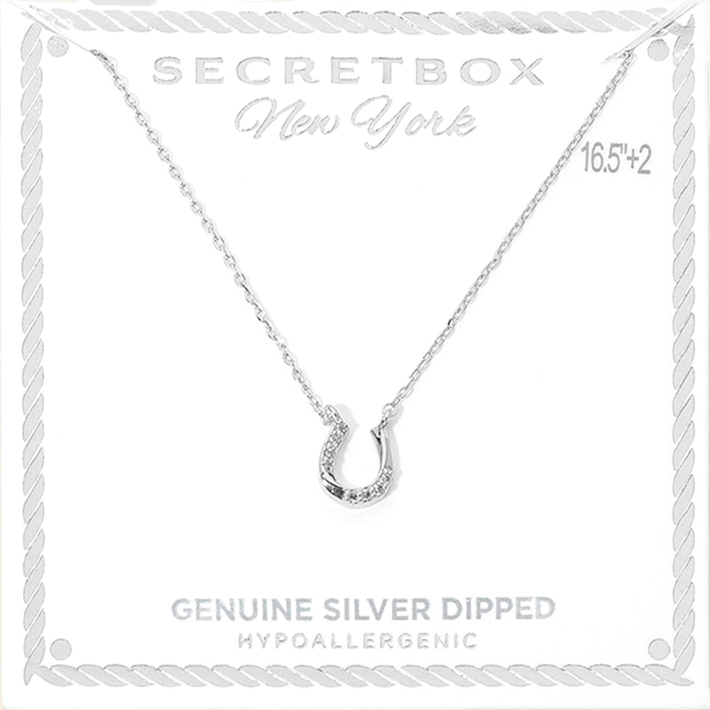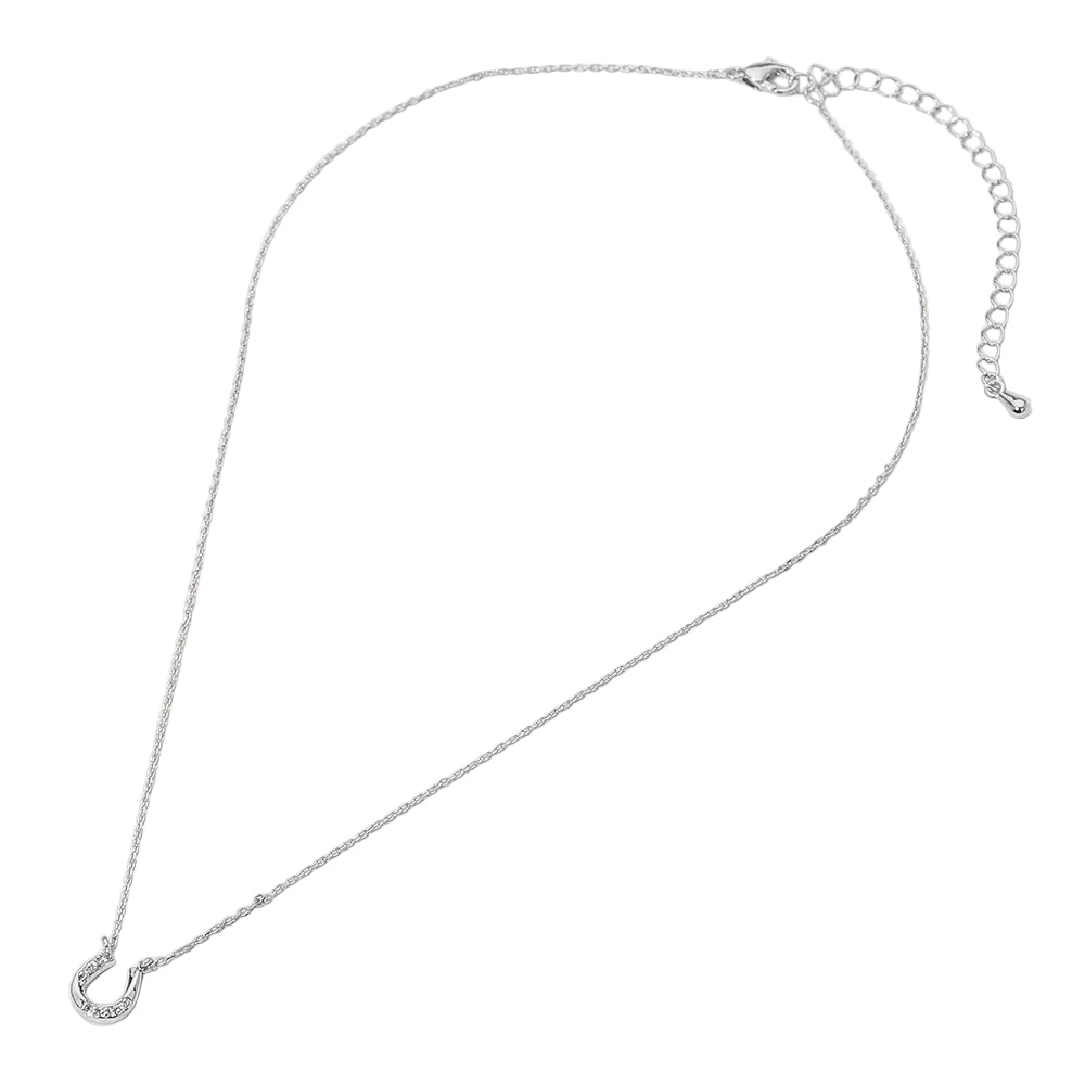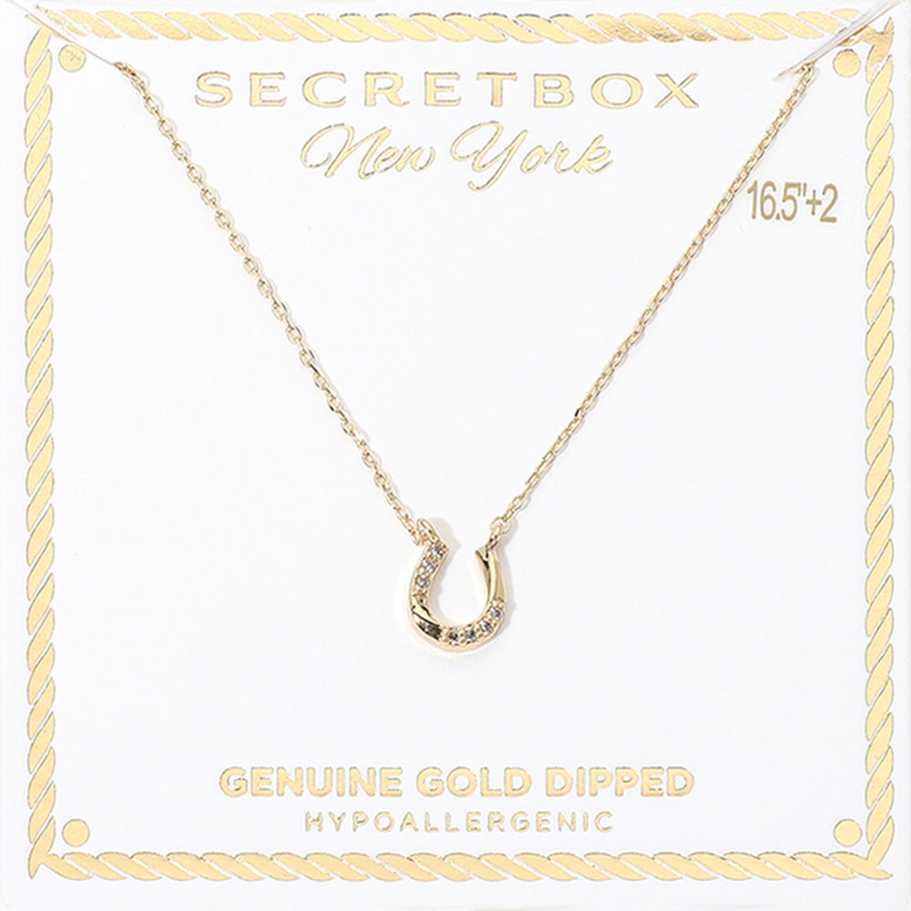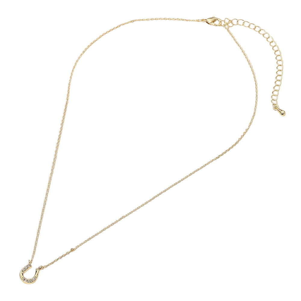 A gold dipped necklace featuring a stone pave horseshoe pendant. Crafted with hypoallergenic materials for comfortable, everyday wear. A simple yet eye-catching piece that adds a touch of shine and symbolism to any look.