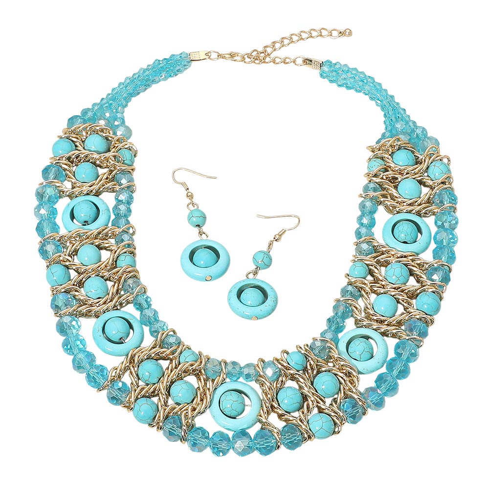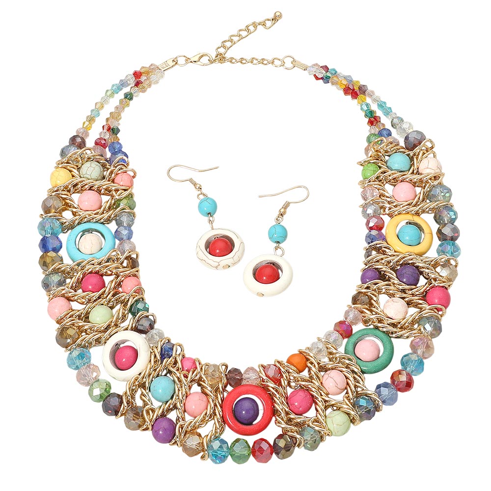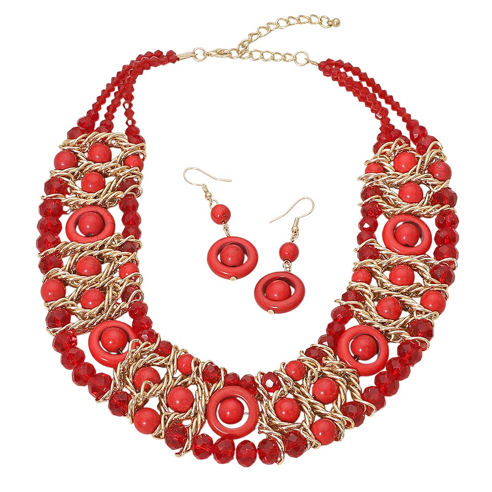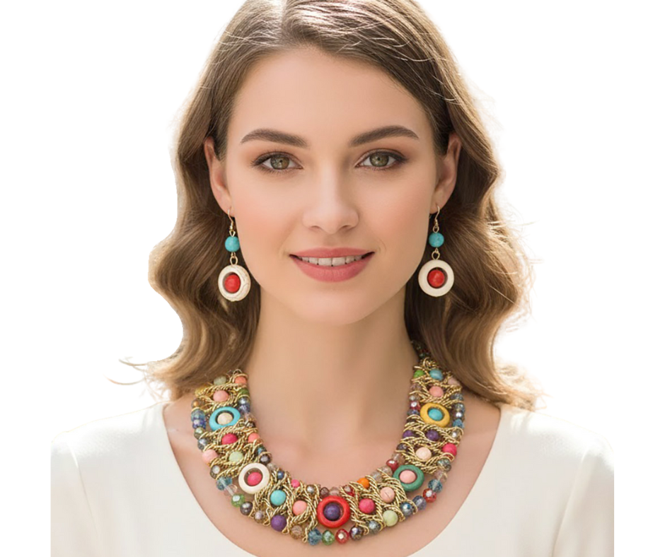 This statement necklace features multiple strands of beads layered together for a bold, eye-catching look. A versatile piece that adds texture and style to both casual and dressed-up outfits.