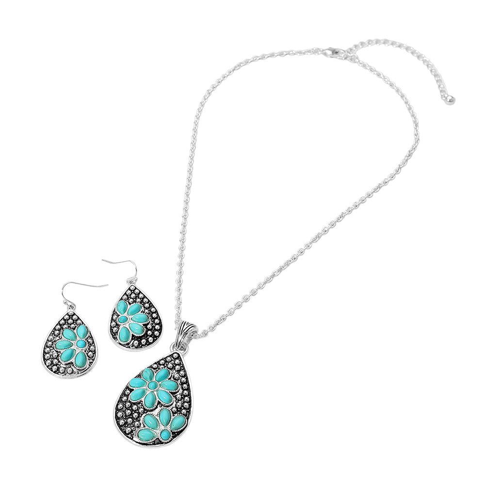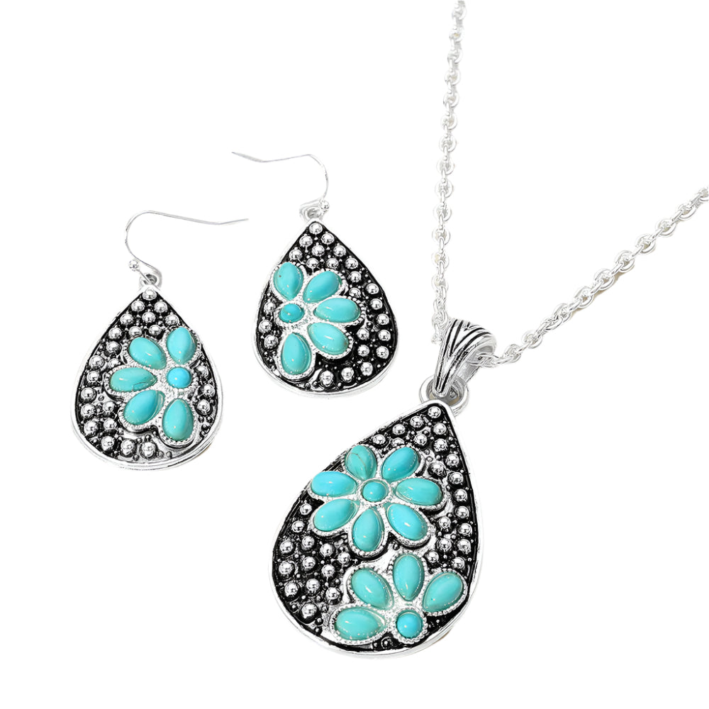 This silver-tone necklace set features a teardrop pendant with a beautifully embossed floral pattern and a pop of turquoise. The textured metal finish adds a rustic touch, making it a standout piece for everyday style or boho-inspired looks.
