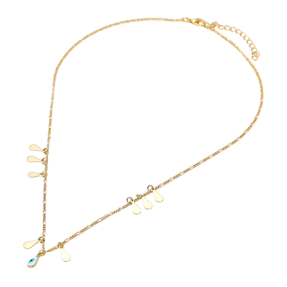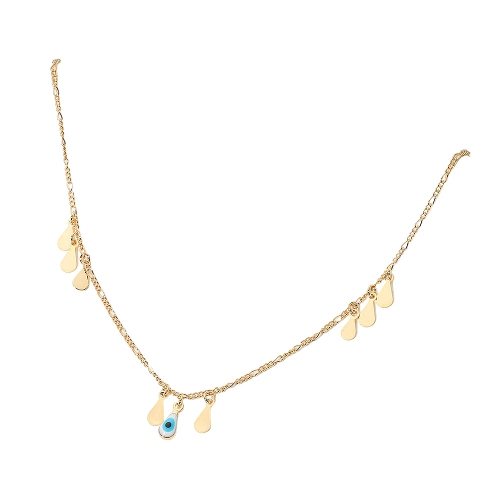 This 18K gold filled devil eye accent teardrop charm station necklace blends style and symbolism beautifully. Featuring alternating teardrop and evil eye charms, it adds a touch of sparkle while offering a sense of protection and good energy. Perfect for layering or wearing solo.