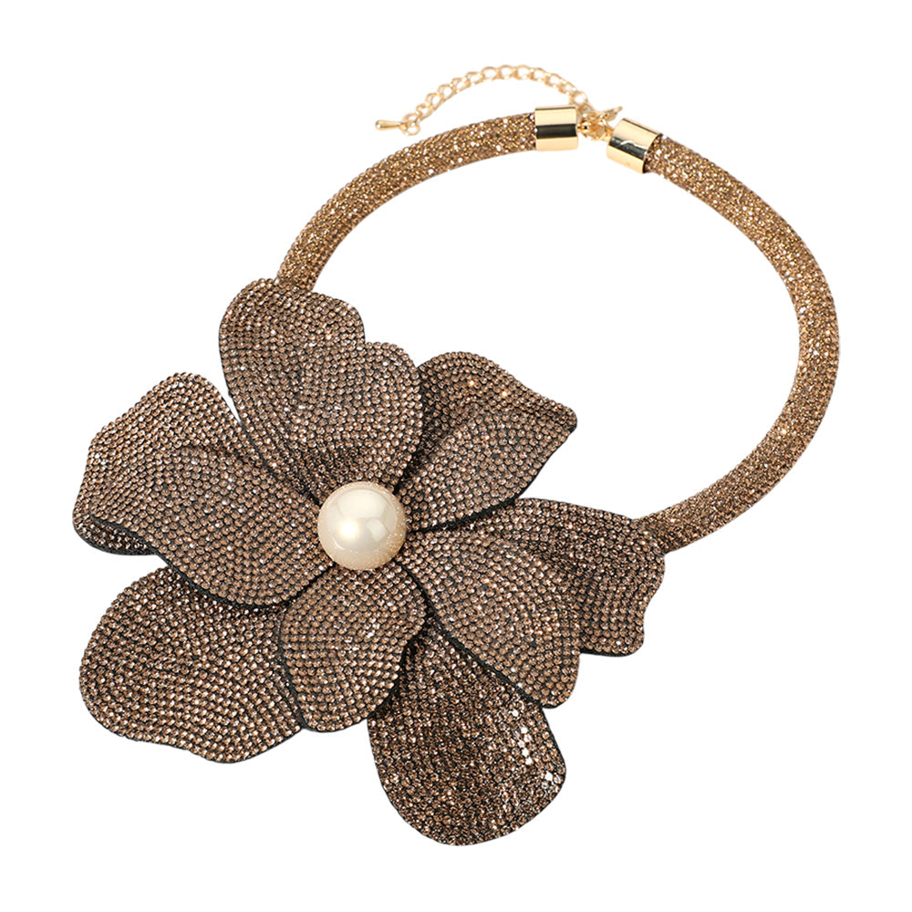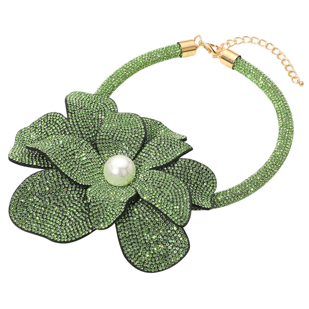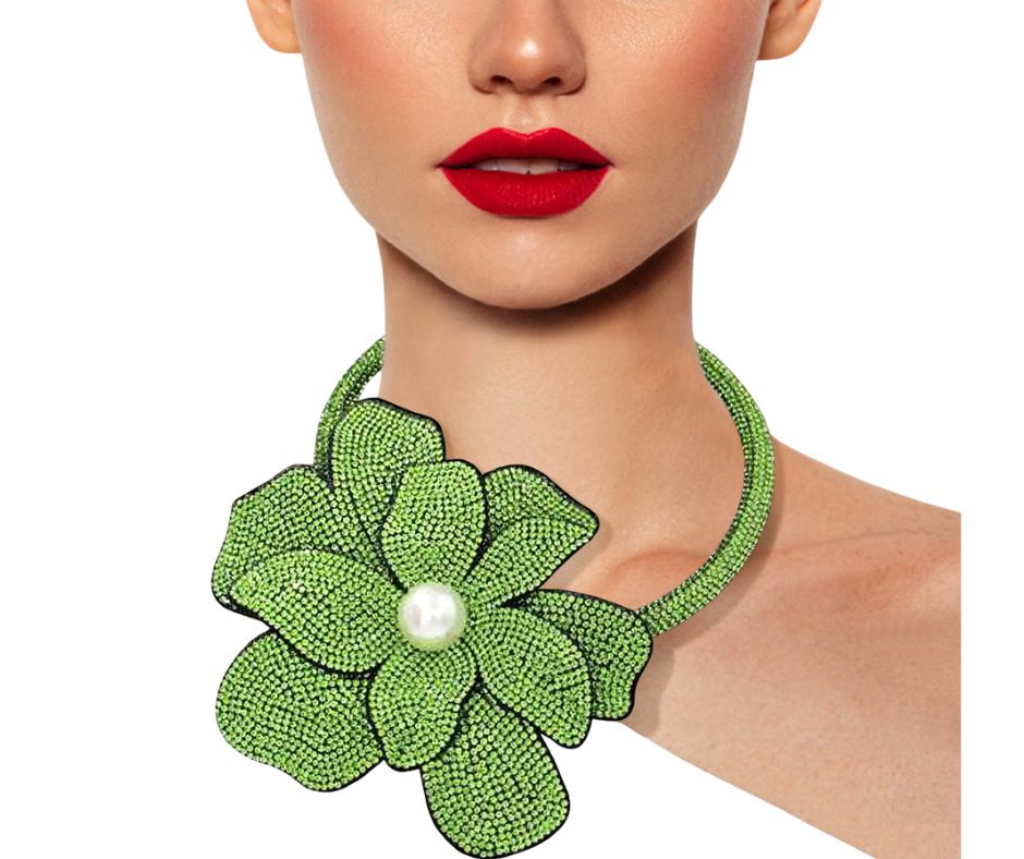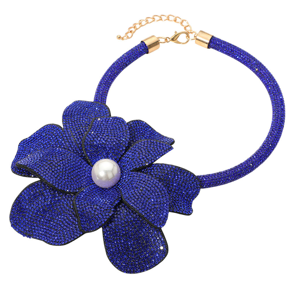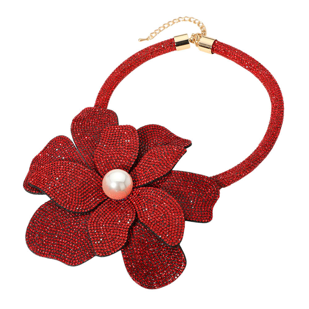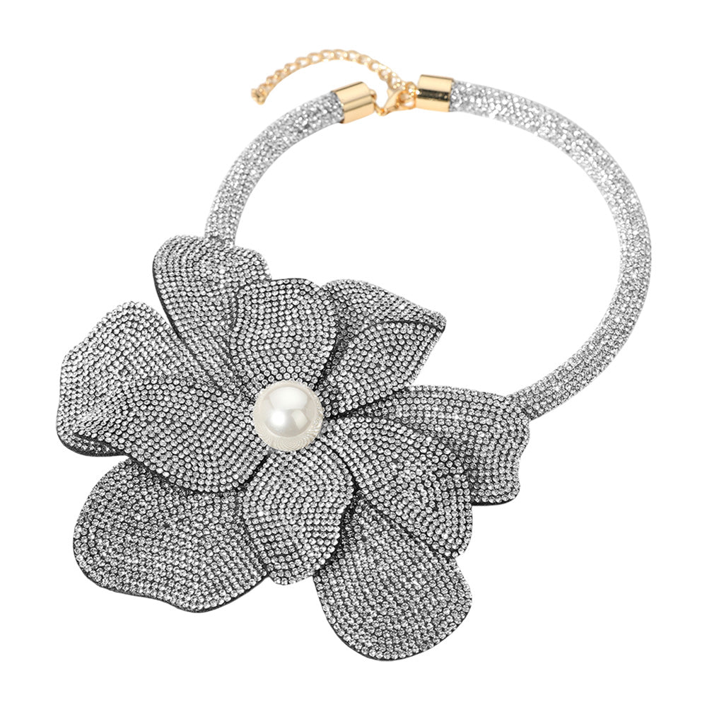 Bling studded oversized flower pointed necklace featuring a bold floral design with sparkling stone accents. Designed to make a statement, this eye-catching piece adds a touch of glamour to both casual and dressy looks.