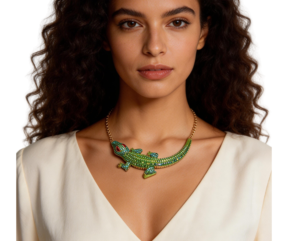 Make a striking impression with this rhinestone paved bold alligator accent statement necklace. Featuring a detailed alligator design fully adorned with shimmering rhinestones, this unique piece brings bold character and eye-catching sparkle. The statement silhouette makes it perfect for adding a dramatic touch to both casual and dressy looks.