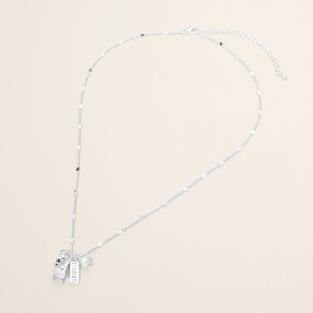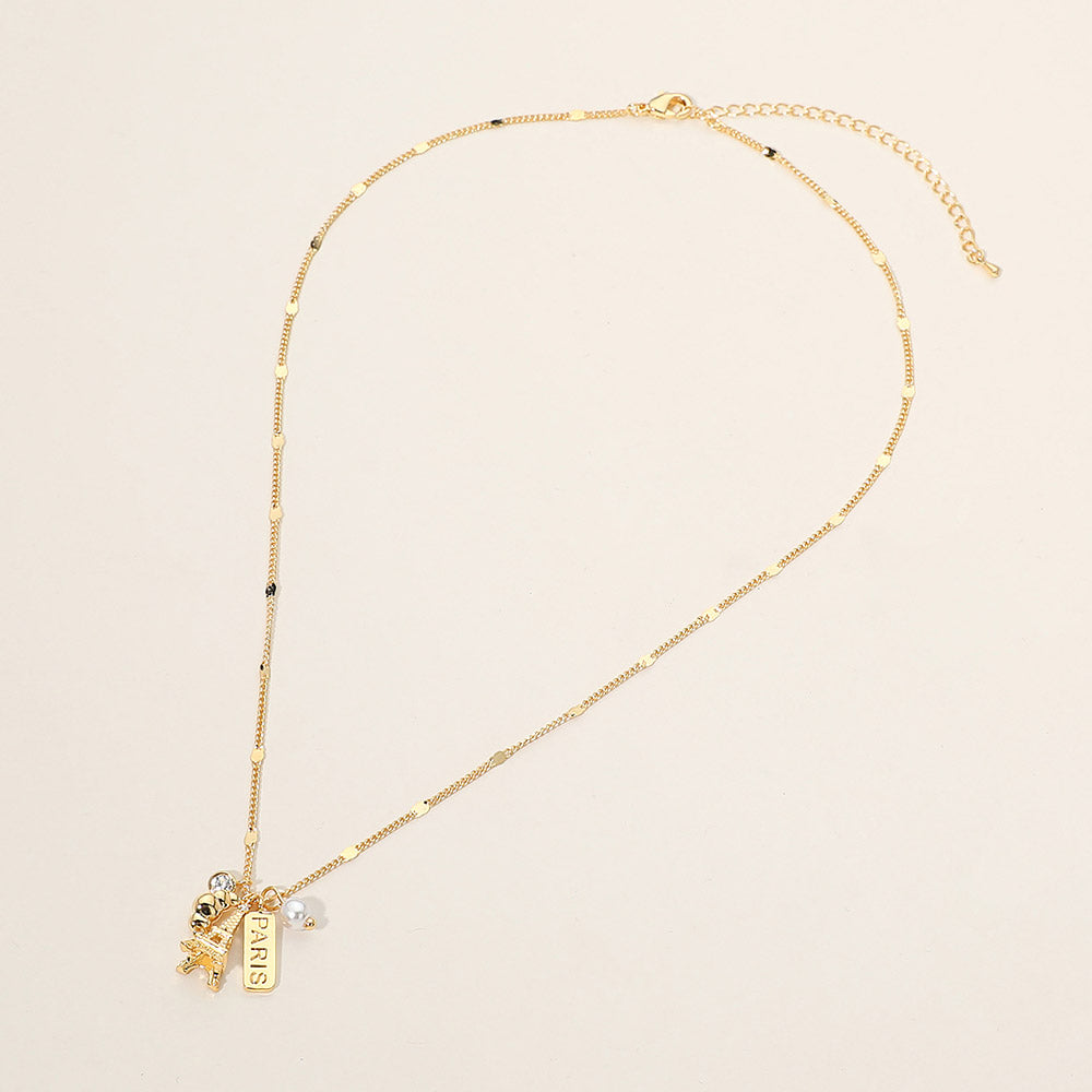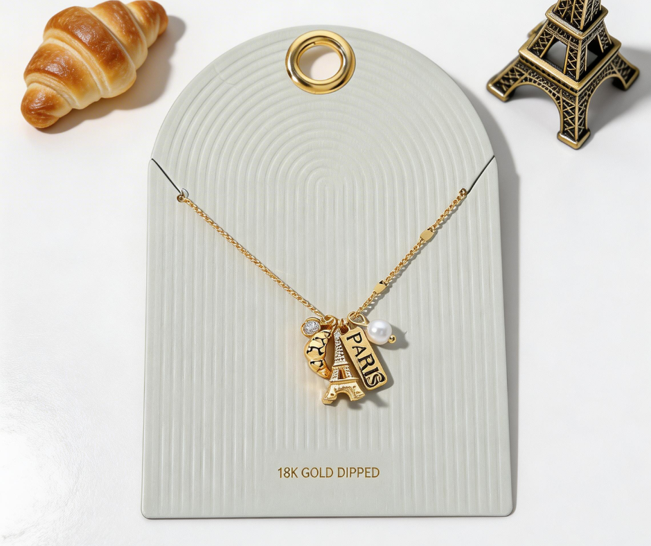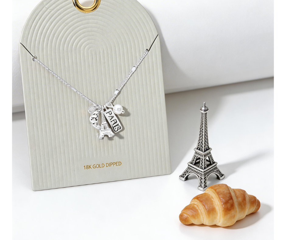 18k gold dipped paris croissant eiffel tower pearl charm necklace featuring charming Paris-themed charms paired with classic pearl accents for a stylish, whimsical look. also available in white gold dipped, this lightweight piece is perfect for everyday wear or adding a touch of parisian flair to any outfit.