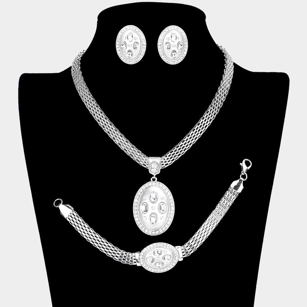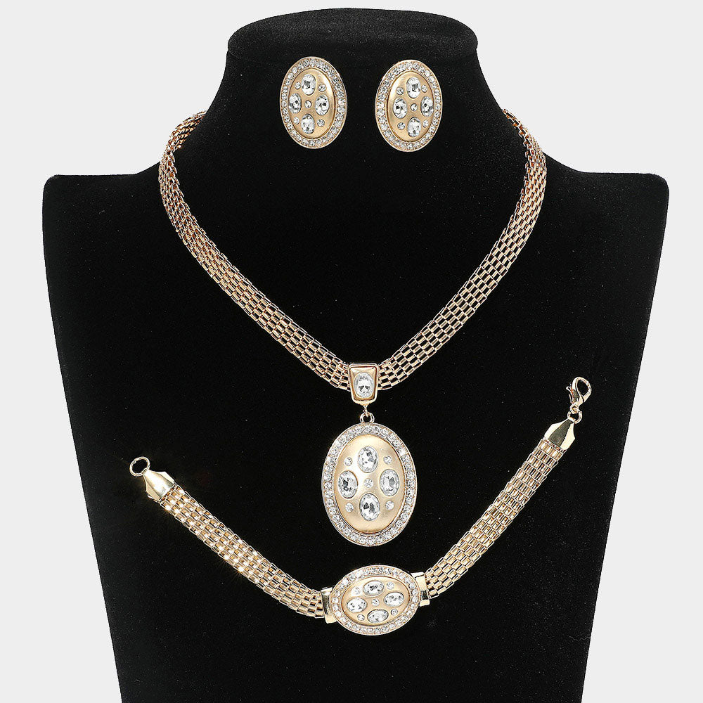 This coordinated set features an oval pendant necklace, matching earrings, and a bracelet, all accented with shimmering marquise rhinestones. Elegant and eye-catching, it’s perfect for adding a polished touch. Great for events, parties, or anytime you want a little extra sparkle.
