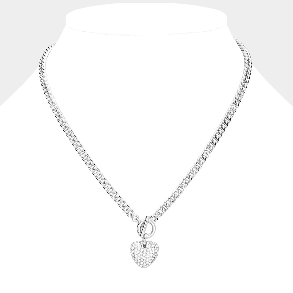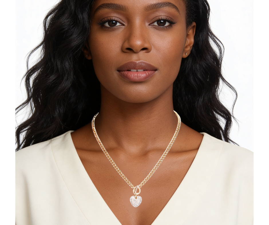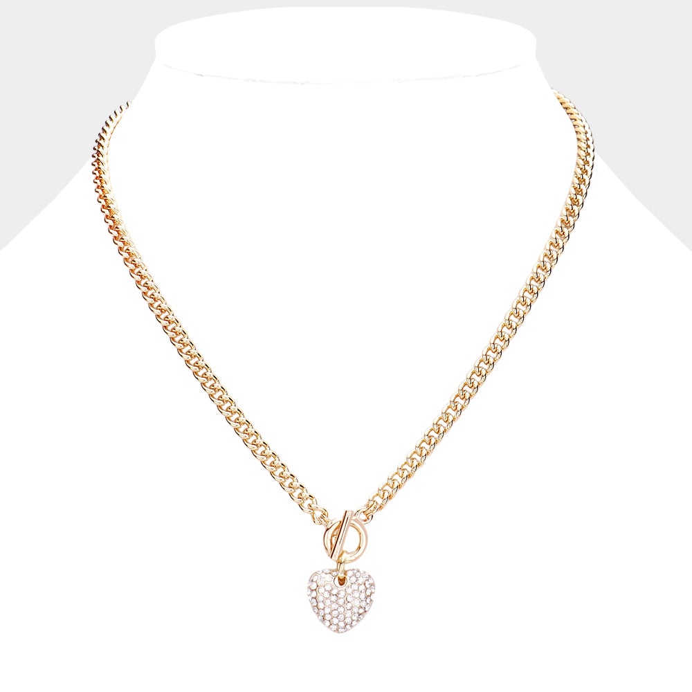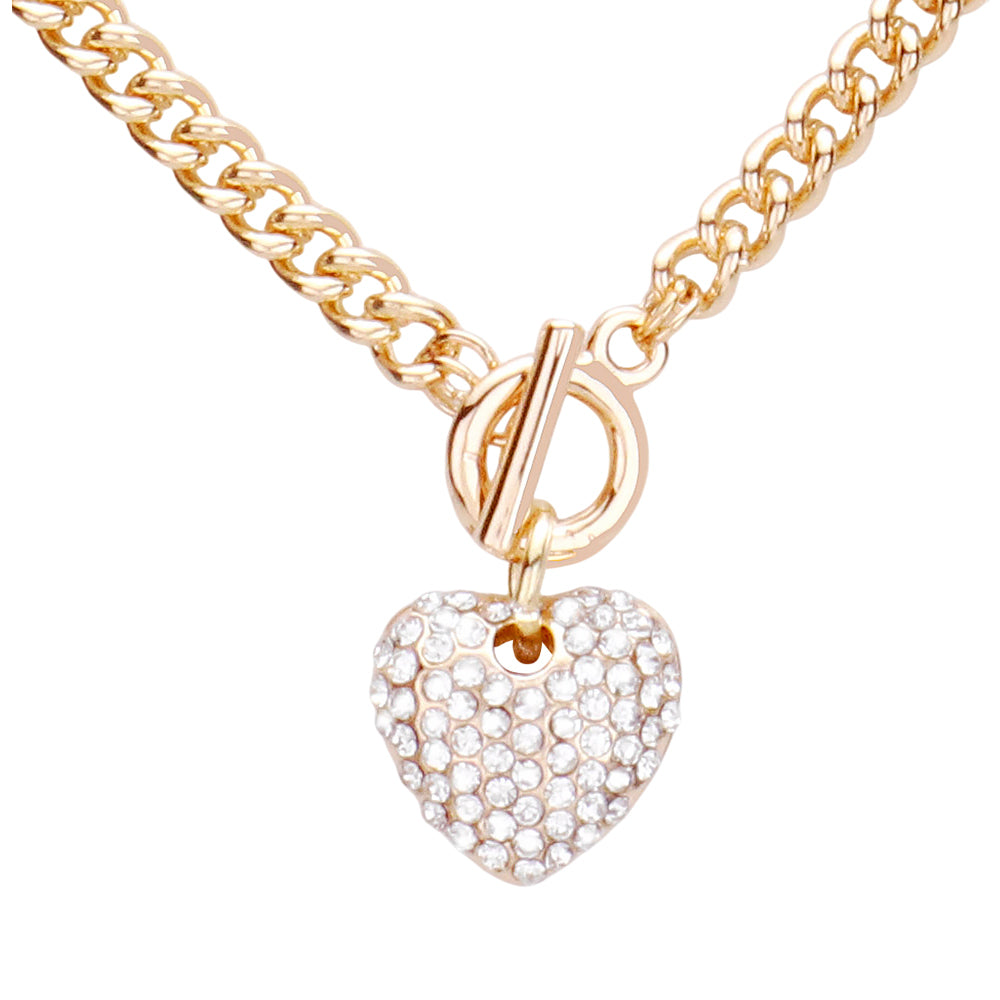 This rhinestone pave heart pendant necklace features a stylish toggle closure for a modern, eye-catching look. Available in gold or silver, it adds just the right amount of sparkle to everyday outfits or special moments. A charming statement piece that’s easy to wear and fun to style.