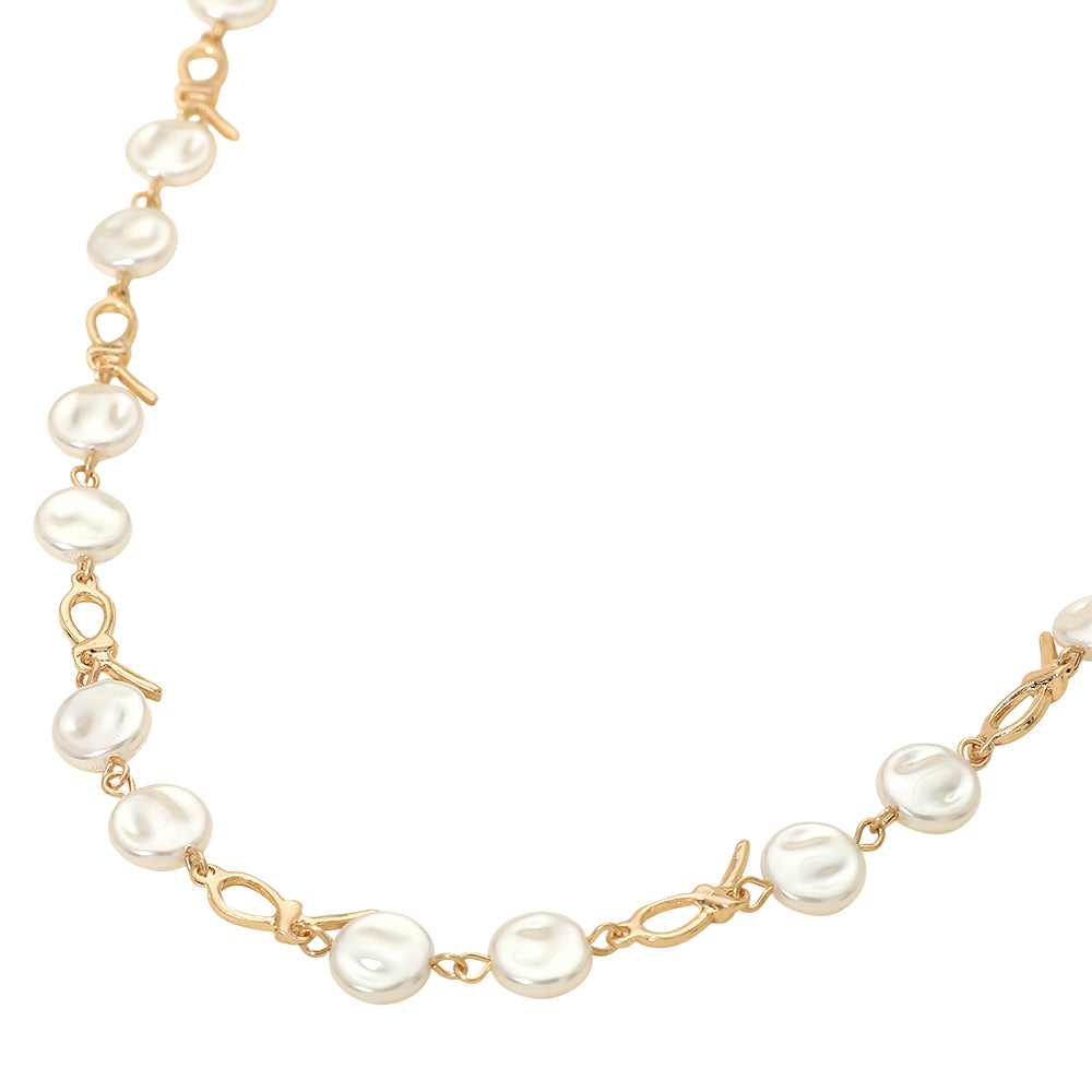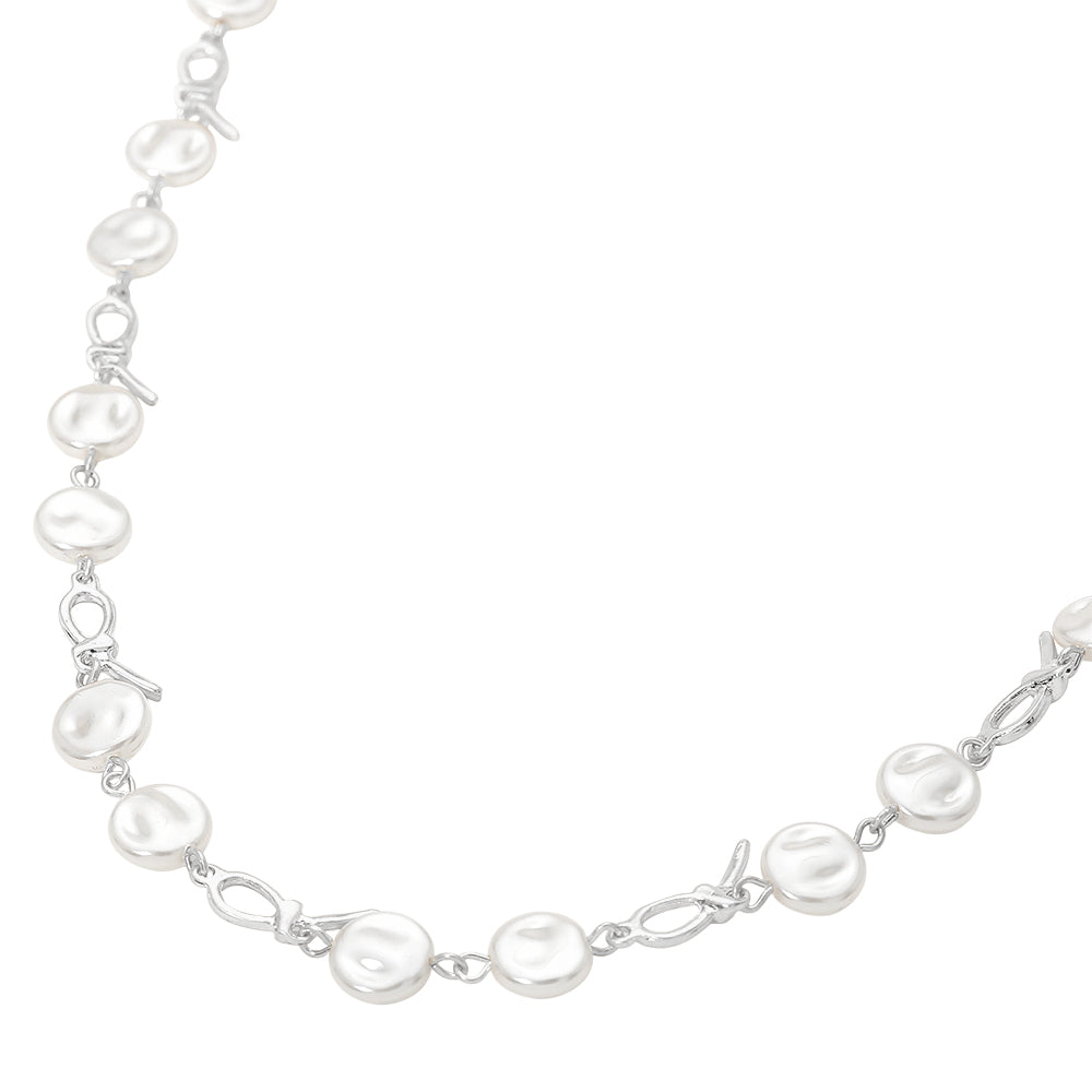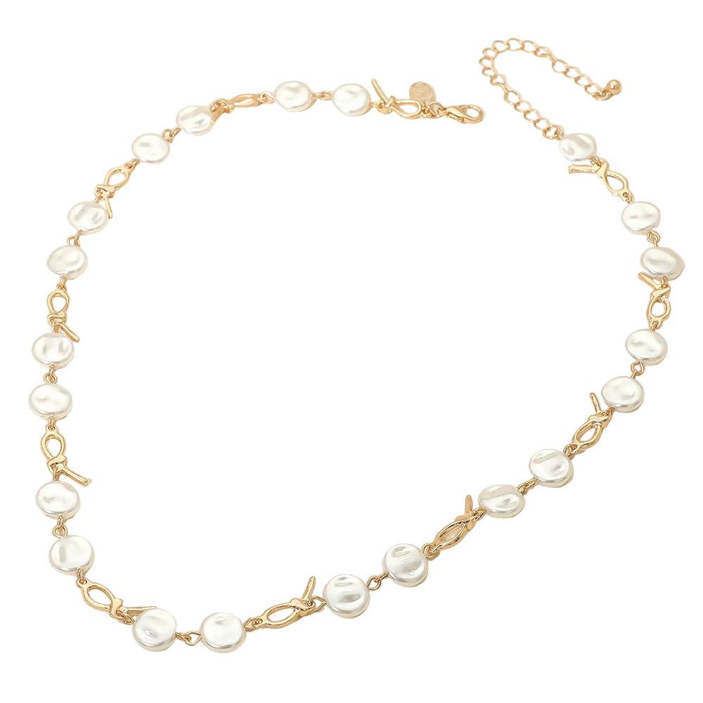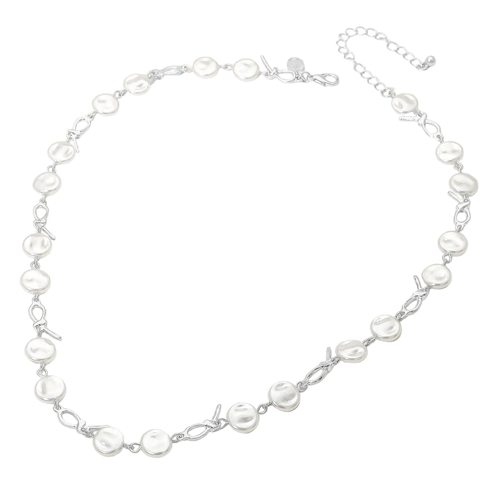 This pearl disc abstract charm link necklace blends modern design with soft, classic detail. The mix of abstract metal links and pearl disc accents creates beautiful contrast and dimension. A unique statement piece that adds interest and polish to any look.