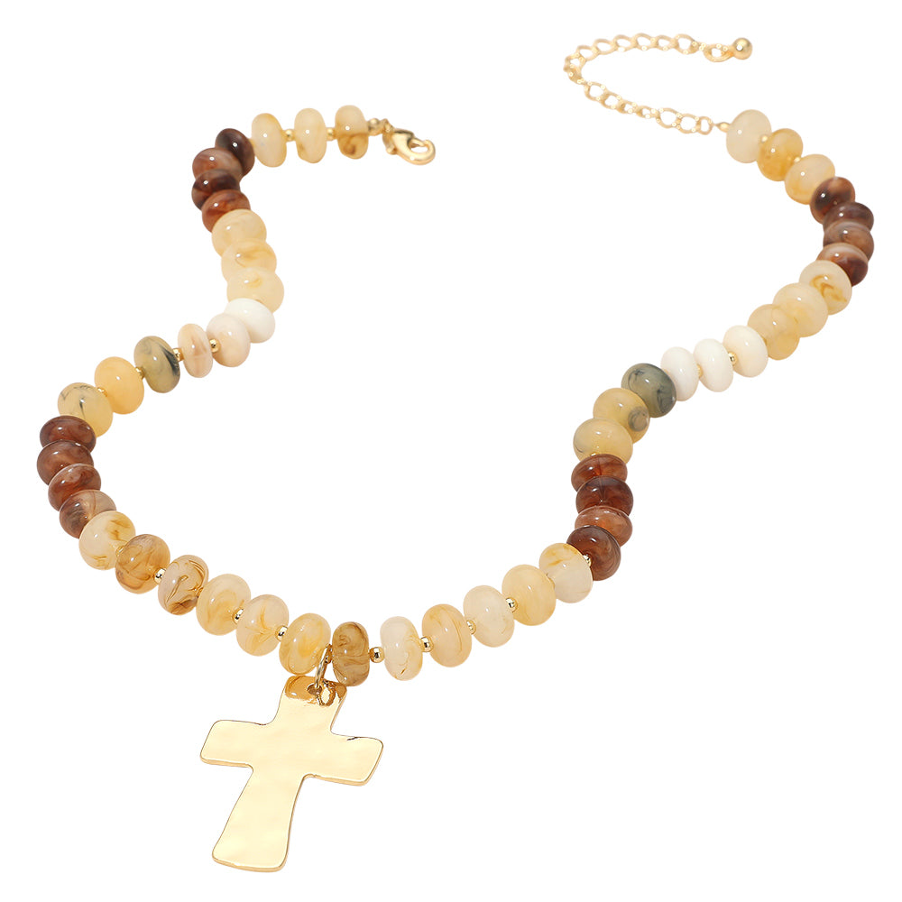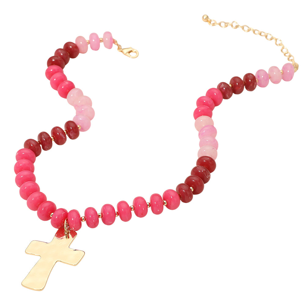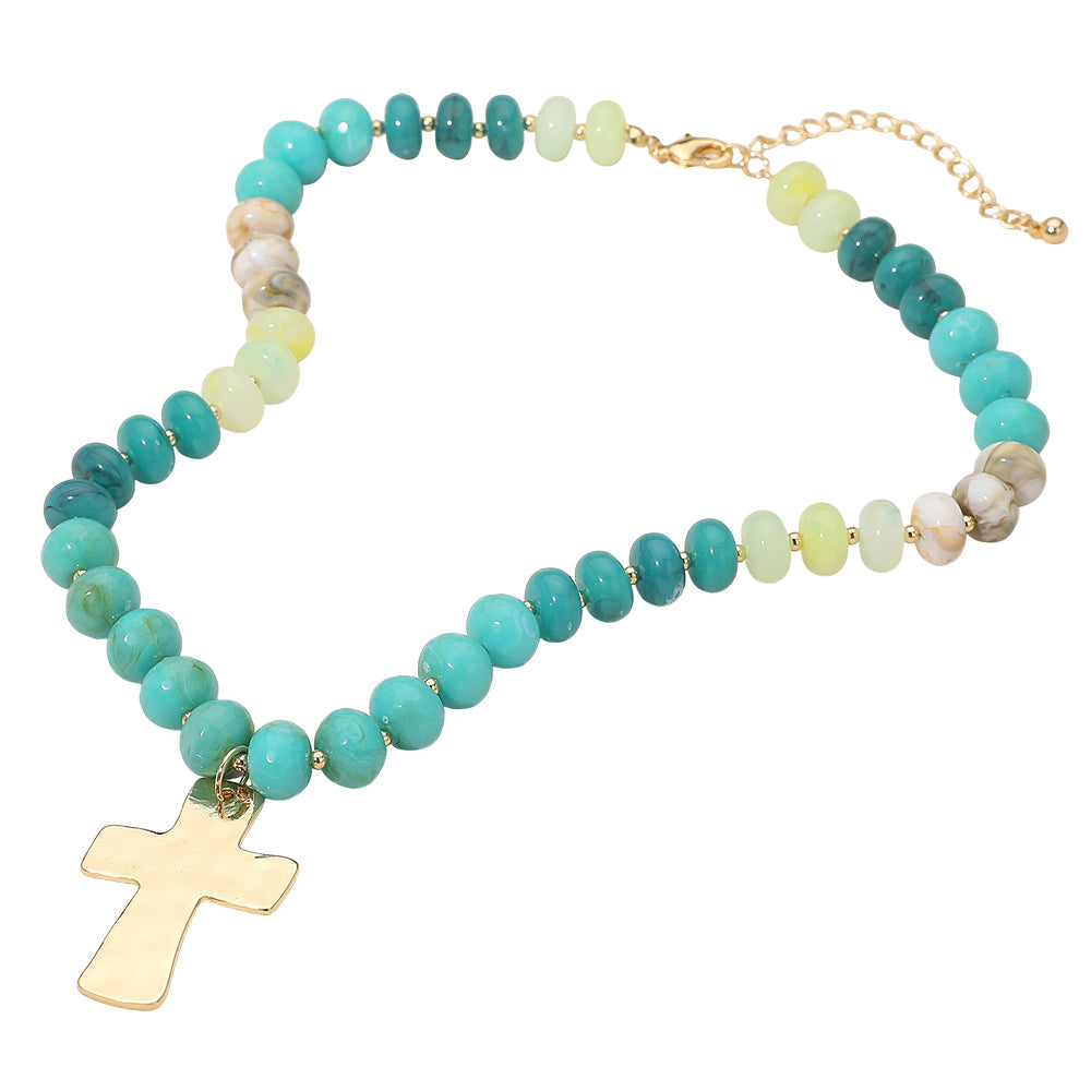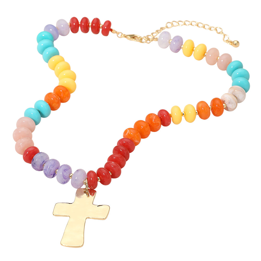 Make a bold statement with this 18K gold dipped hammered cross plate pendant necklace. The chunky resin disc beads add rich texture and dimension, while the cross plate pendant brings a meaningful and stylish finish. A striking piece that blends faith with fashion.
