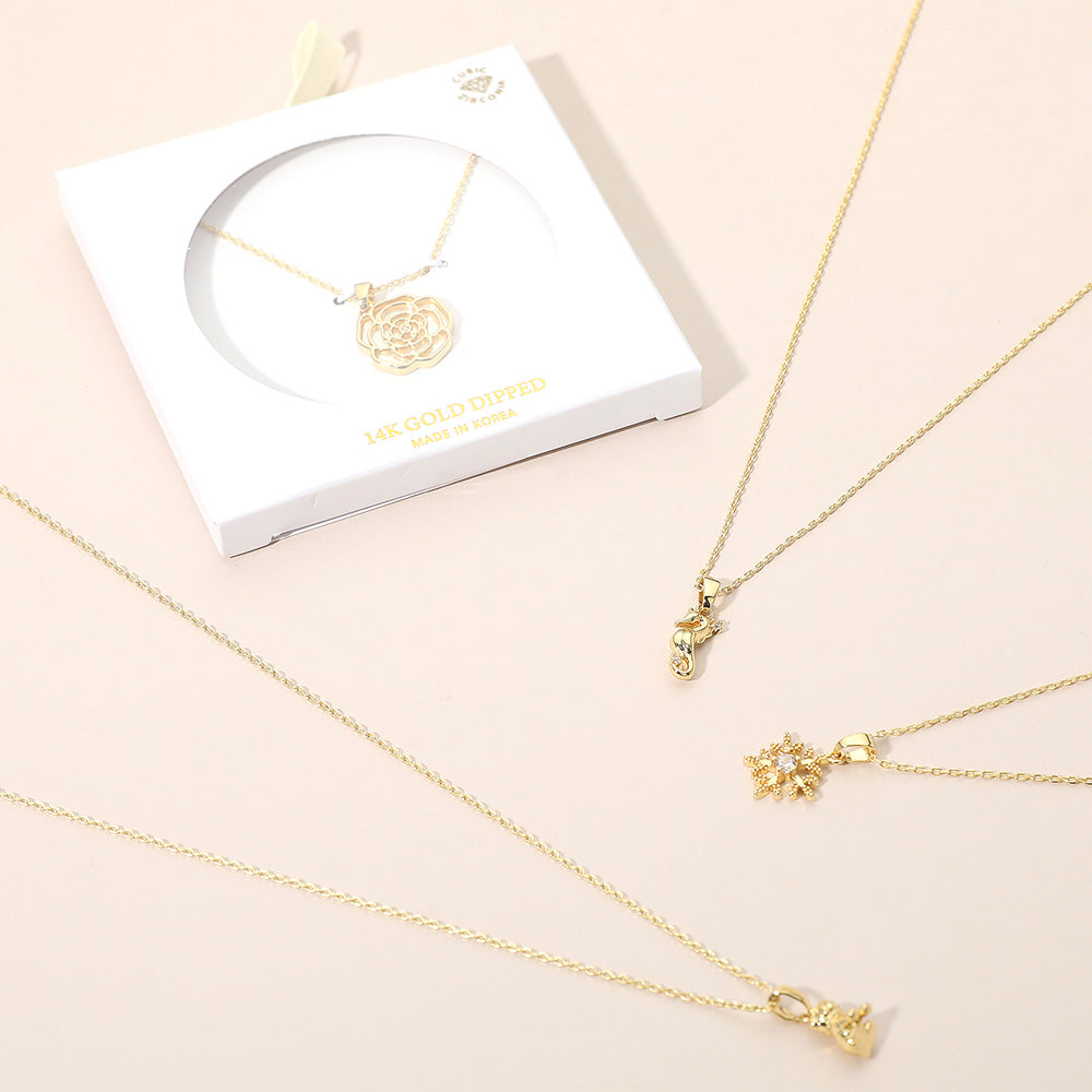 This 14K Gold Dipped Pendant Necklace comes in a variety of styles including Heart, Rose Bloom, Star, Sea Shell, Ginkgo Leaf, and Rose. Each piece is designed with a delicate finish, making it a versatile choice for everyday wear or as a thoughtful gift.