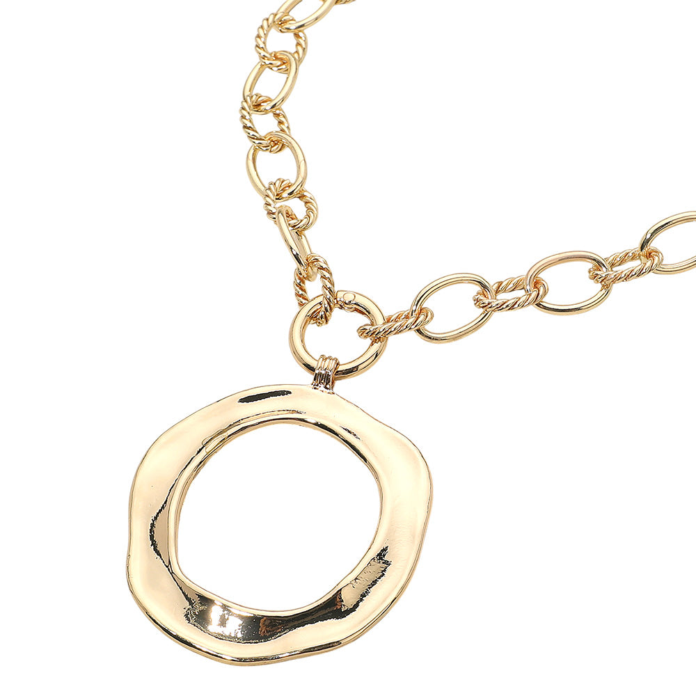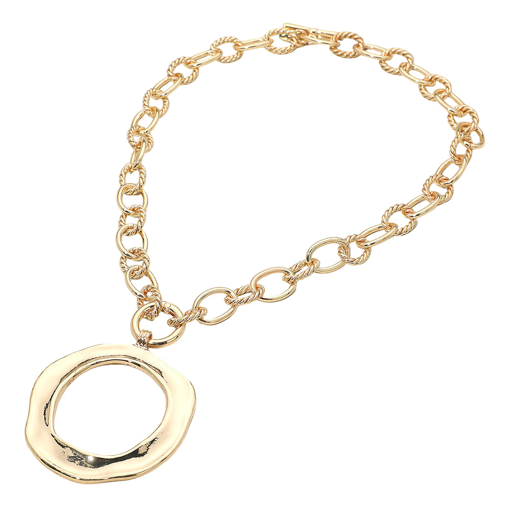 Modern Sculpted Circular Pendant Chain Link Necklace features a sleek sculpted circle pendant on a stylish chain link design. Perfect for adding a touch of contemporary flair to any outfit.