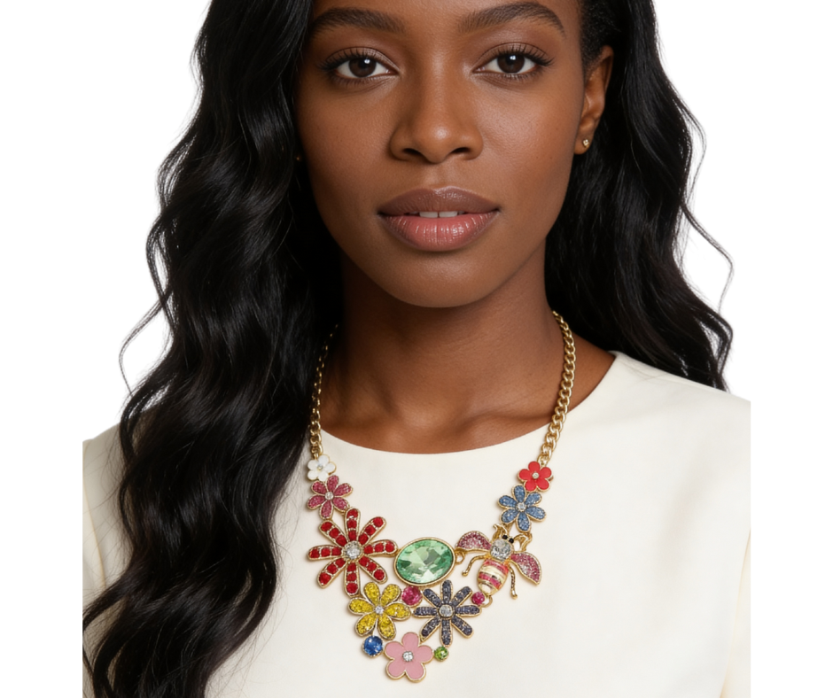 This statement necklace features a rhinestone-accented honey bee with delicate floral details that catch the light beautifully. Designed to stand out, it brings a playful yet polished touch to both casual and dressy looks. Perfect for adding a little sparkle and personality to your jewelry collection.