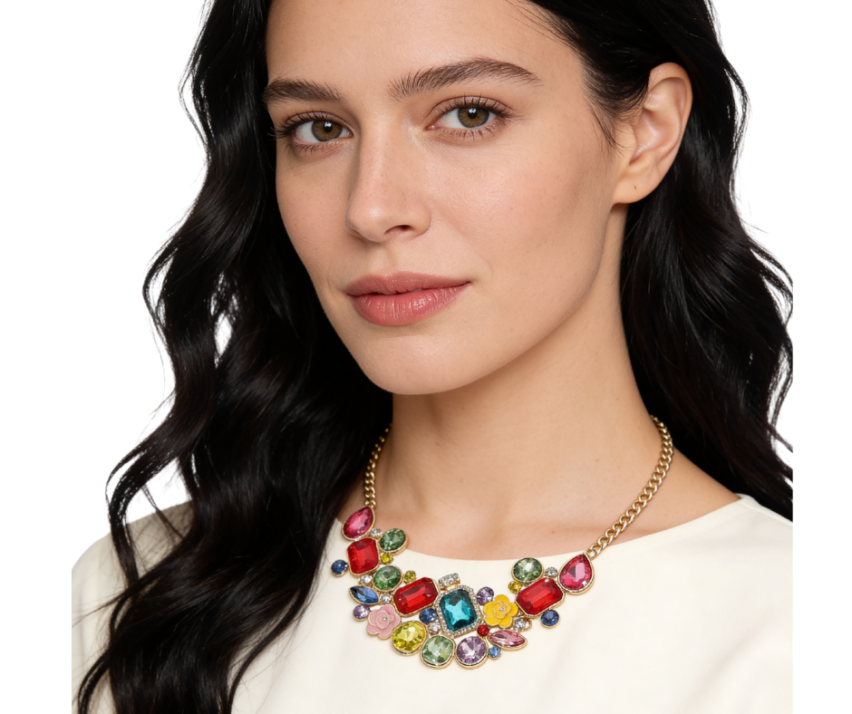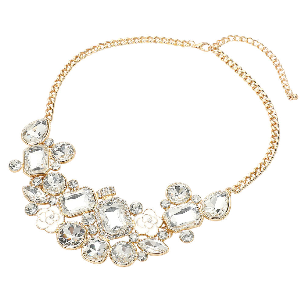 This statement necklace features a floral-inspired design with clustered stones that add texture and visual interest. A standout piece that brings a polished finish to both casual looks and special occasions.