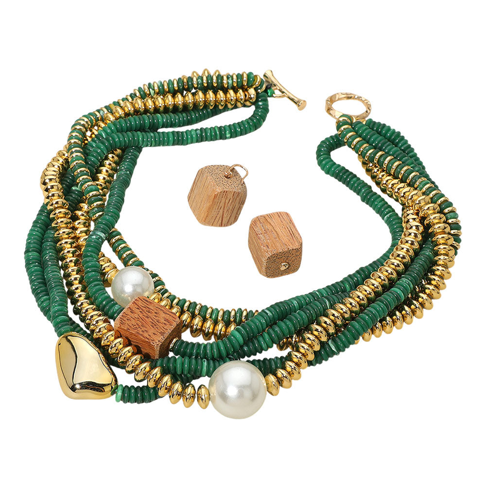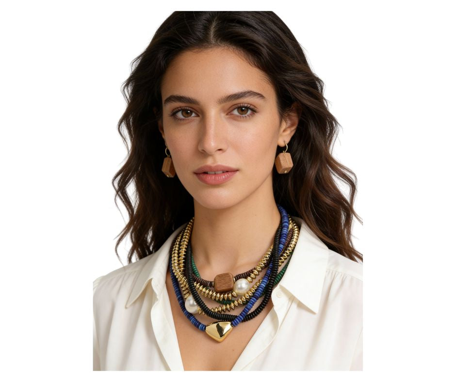 This bold layered statement necklace combines chunky pearls, wooden cube accents, metal pebble details, and multi-disc beads for a unique, eye-catching look. Finished with a toggle closure, it brings texture, depth, and standout style to any outfit—perfect for making a memorable impression.