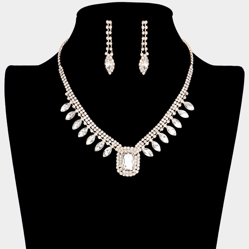 This stunning set features a bold emerald-cut center stone surrounded by sparkling rhinestones for timeless shine. Paired with matching earrings, it’s perfect for special occasions or adding a touch of glamour to your look. Available in gold or silver.