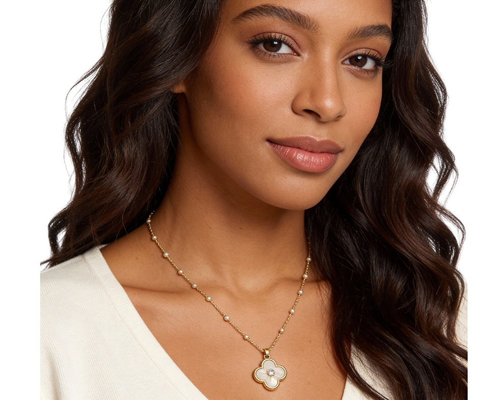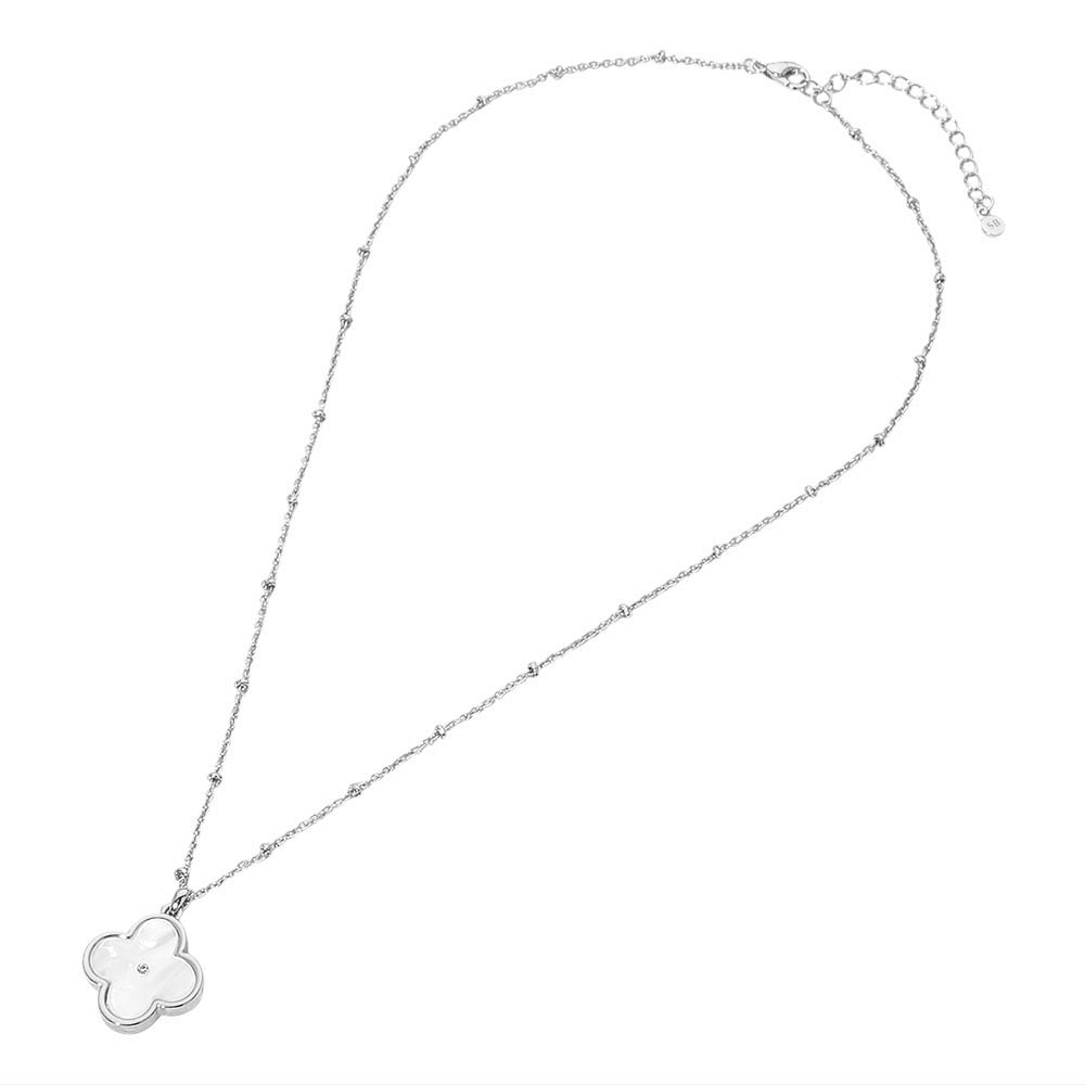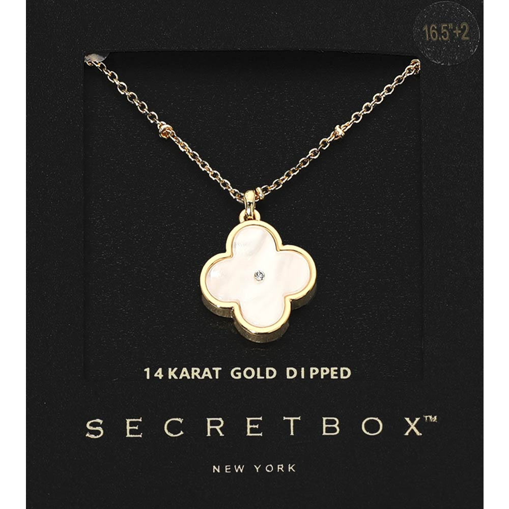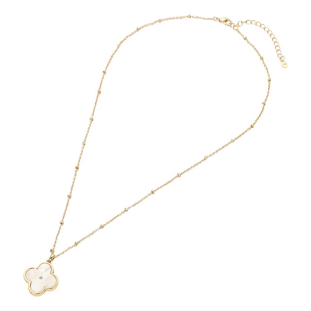 This 14K gold dipped necklace features a stone-accented quatrefoil pendant with a clean, polished look. Designed to be lightweight and easy to wear for everyday styling. Also available in white gold dipped for a versatile finish option.