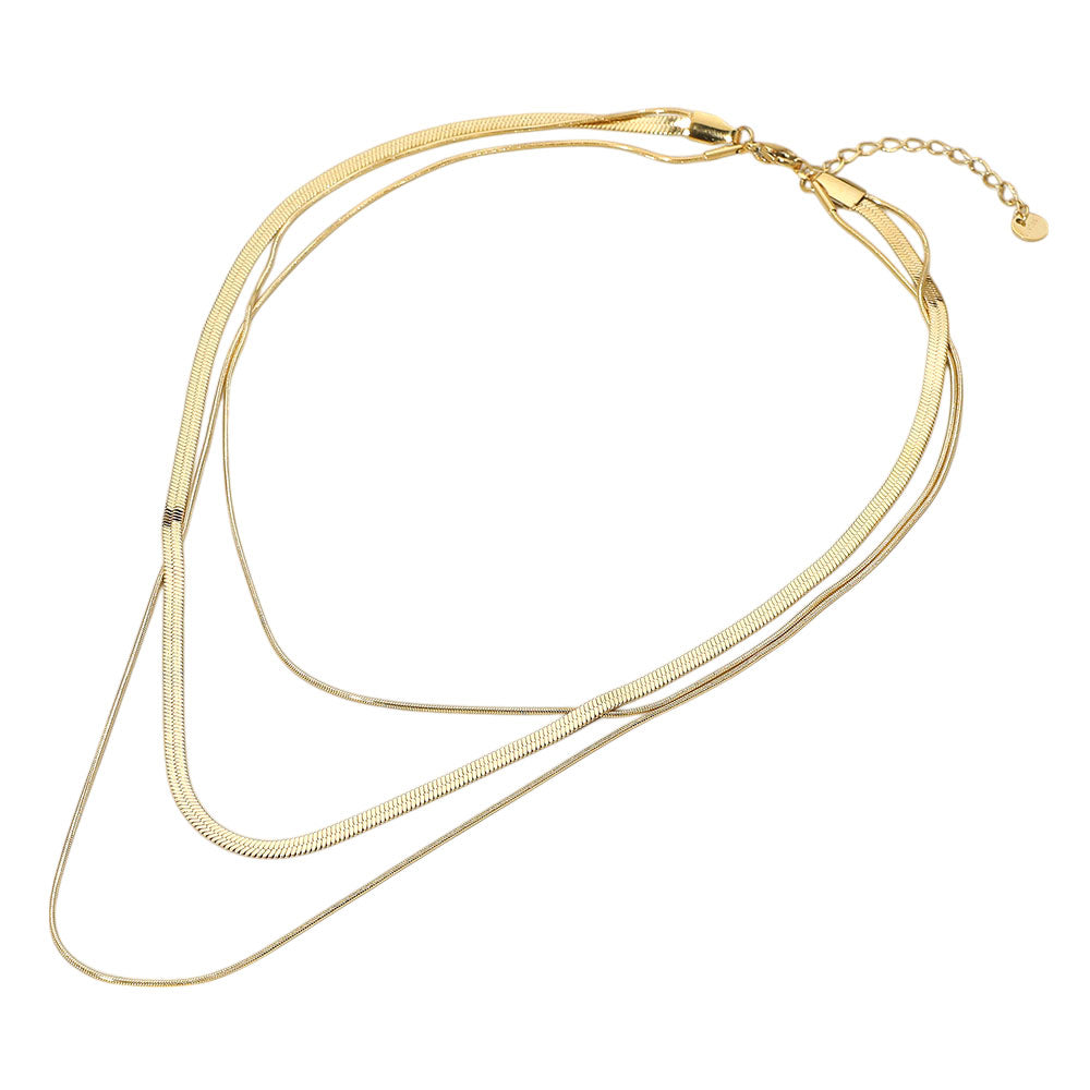 Sleek and modern, this necklace features three layers of smooth snake chains for a bold yet versatile look. Crafted from durable stainless steel, it’s perfect for everyday wear or layering with other pieces. Available in gold or silver.