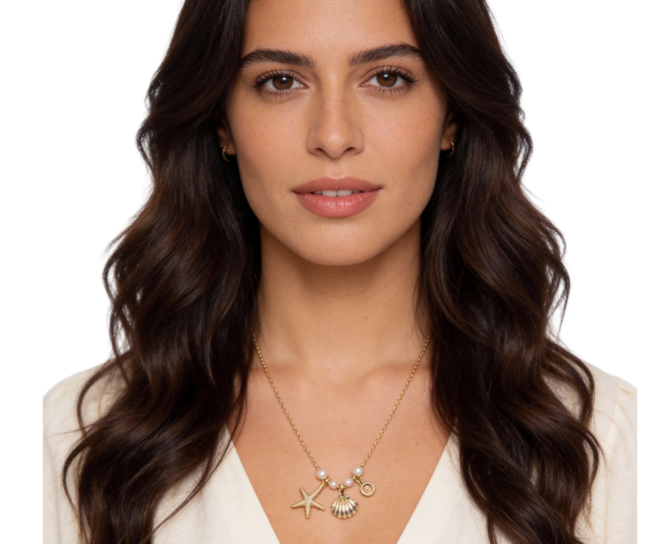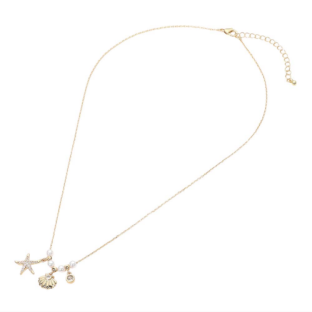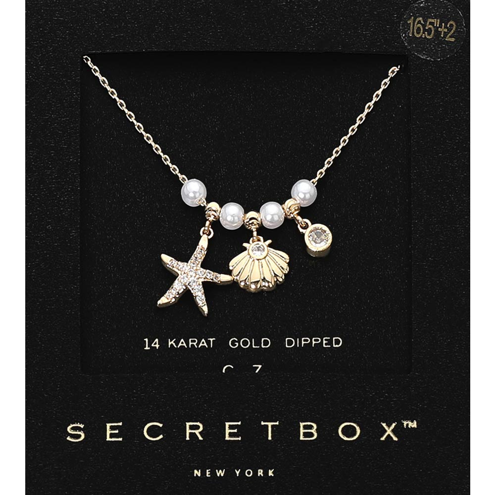 This 14K gold dipped necklace features a cubic zirconia pave starfish shell bezel charm accented with pearl beaded details. The mix of sparkle and soft texture creates a coastal-inspired yet polished look. A standout piece that adds charm and shine to everyday or vacation styling.