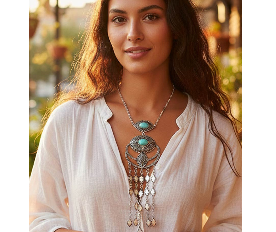 Channel effortless boho vibes with this Turquoise Stone Accent Plate Tassel Pendant Statement Necklace. Featuring a bold engraved plate, vibrant turquoise stone detail, and flowing tassel accents, it’s the perfect blend of earthy charm and standout style. Pair it with flowy dresses, denim, or layered looks for a free-spirited finish that turns heads wherever you go.