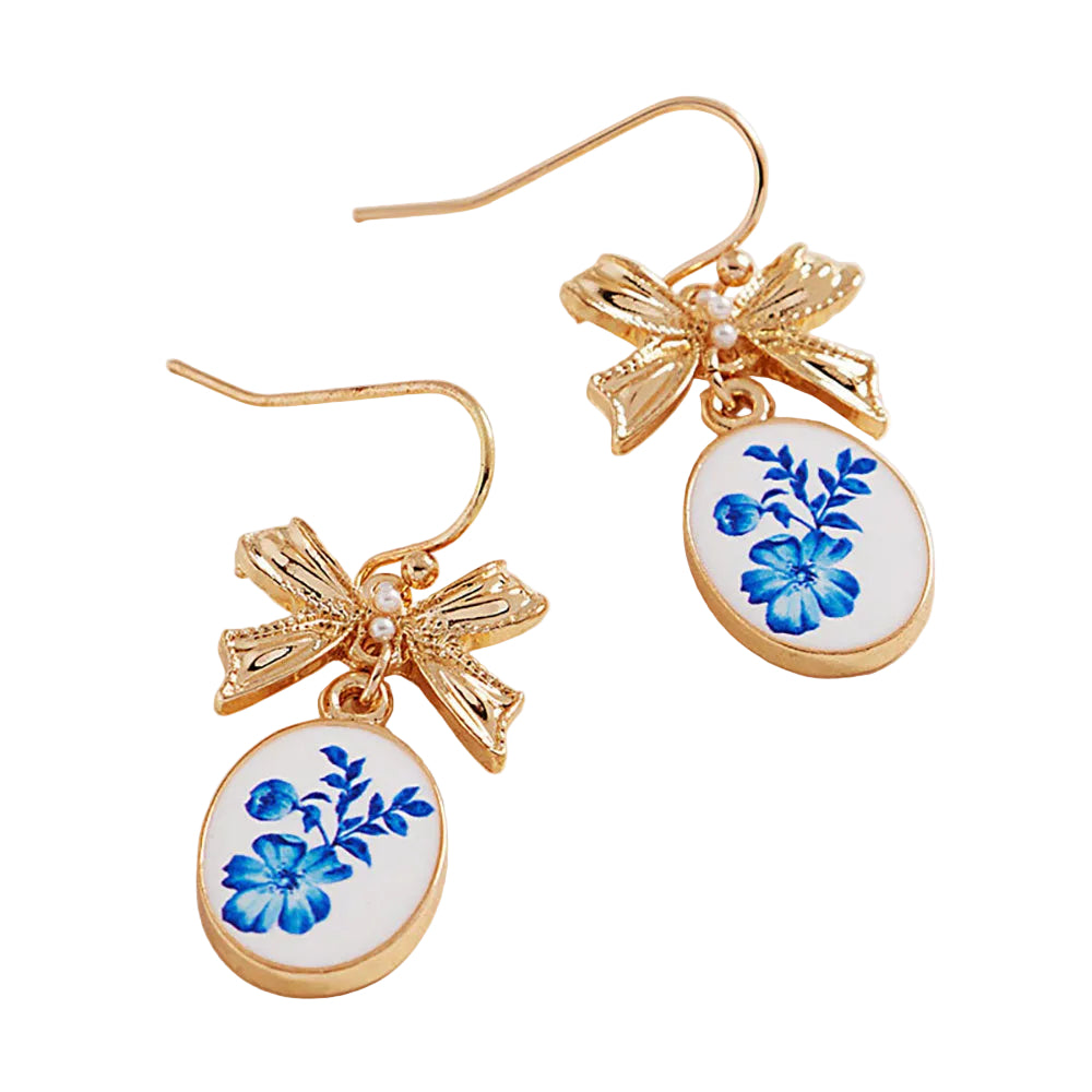 Bow enamel oval floral charm link drop dangle earrings featuring a playful bow design connected to an oval floral charm with enamel detailing. Lightweight with gentle movement, these earrings add a fun and charming touch to any outfit.