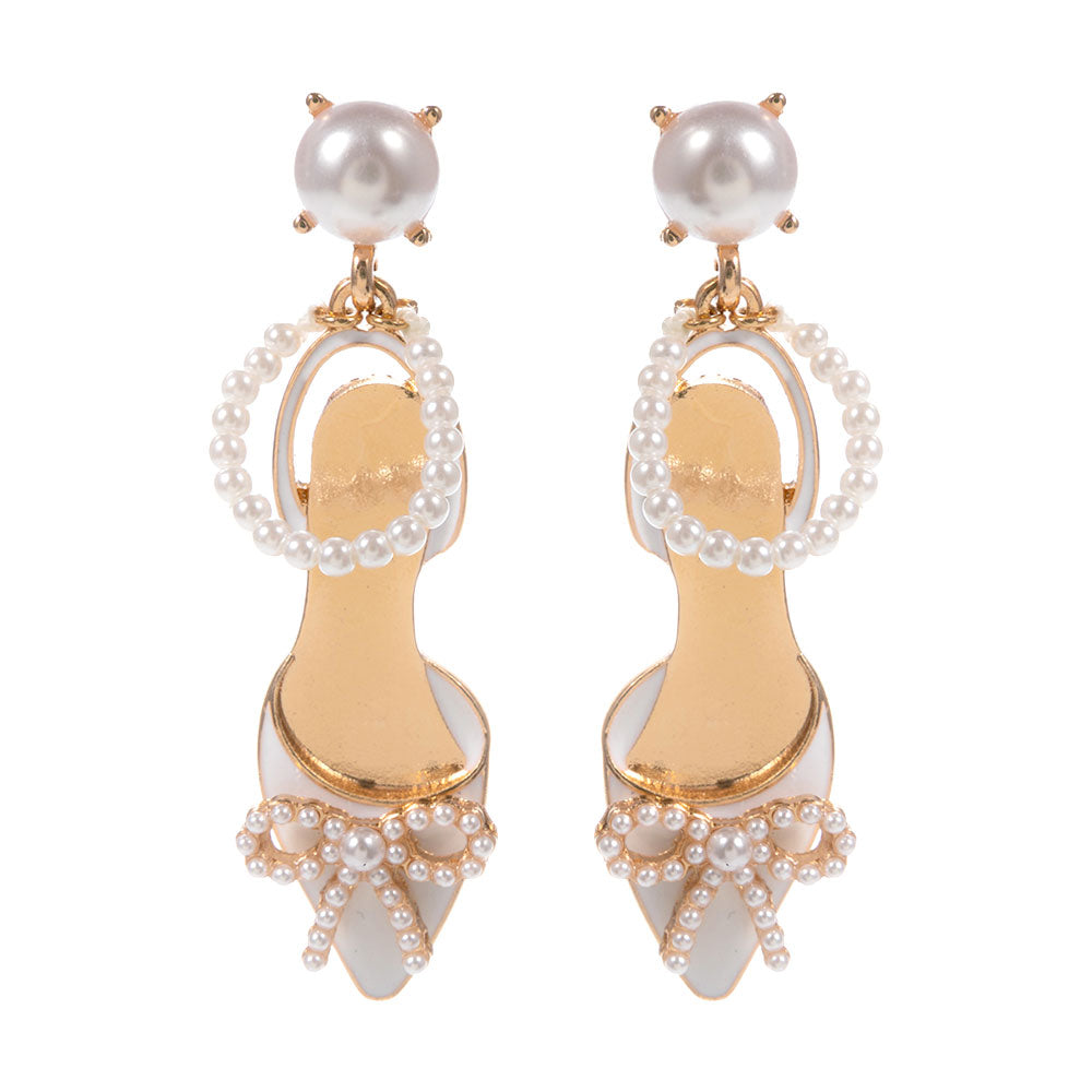 Bride pearl heel drop dangle earrings featuring charming miniature bridal heels accented with pearls. Designed with playful movement, these earrings add a festive and whimsical touch—perfect for bridal celebrations or wedding-themed outfits.