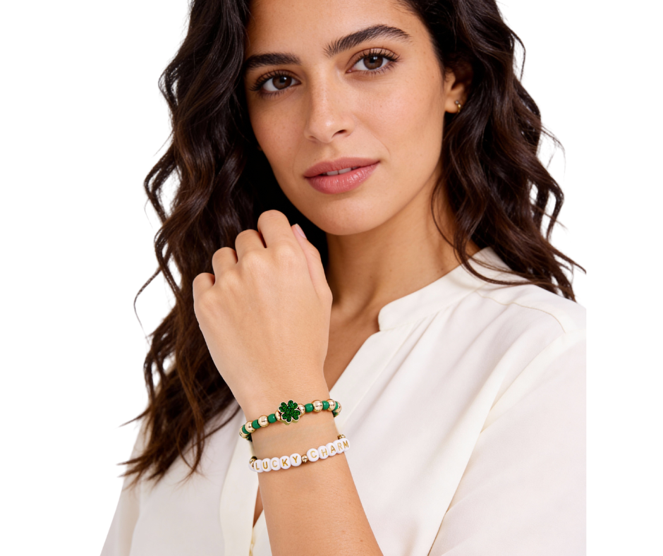 A festive layered bracelet set featuring shamrock charms and letter beads that spell out a lucky message. Designed with heishi-style beads and stretchy bands for an easy, comfortable fit. Wear together for a stacked look or mix with other favorites to celebrate the season in a fun, playful way.