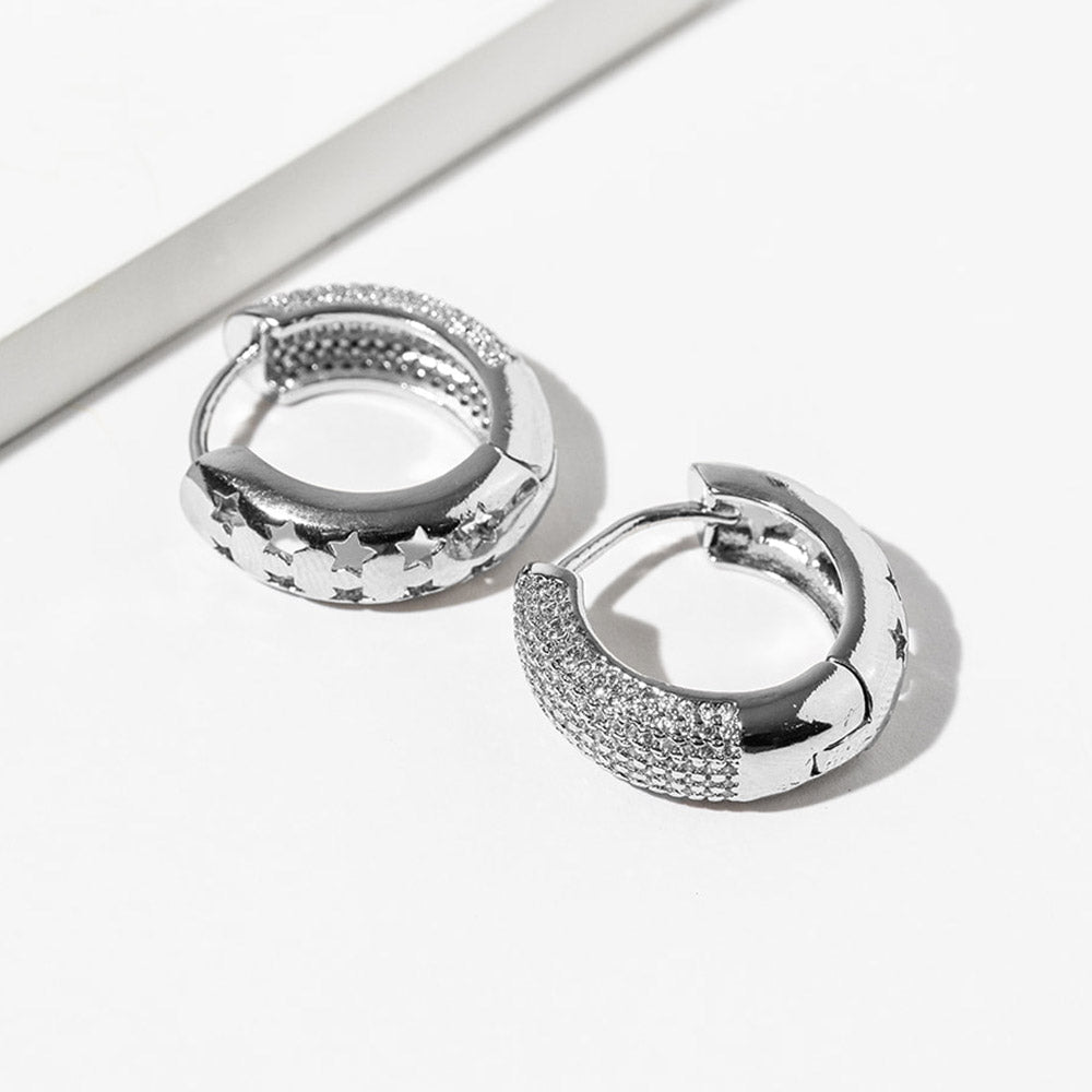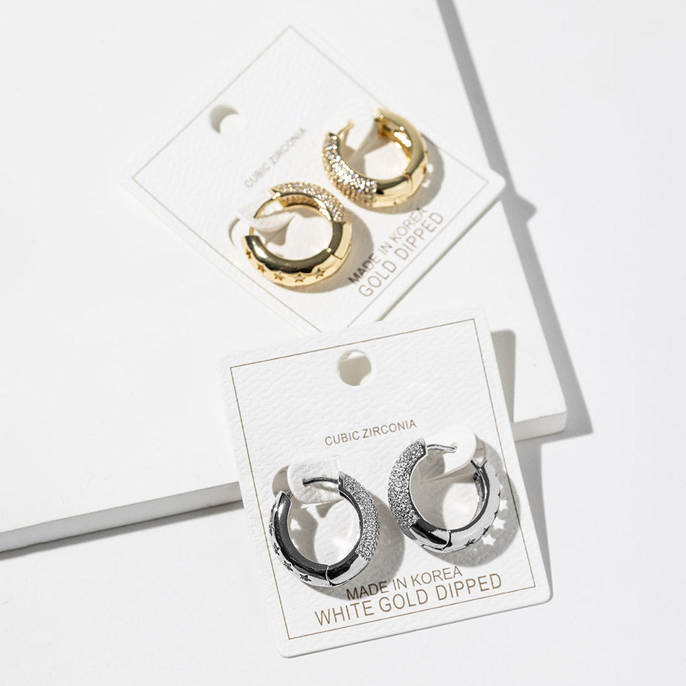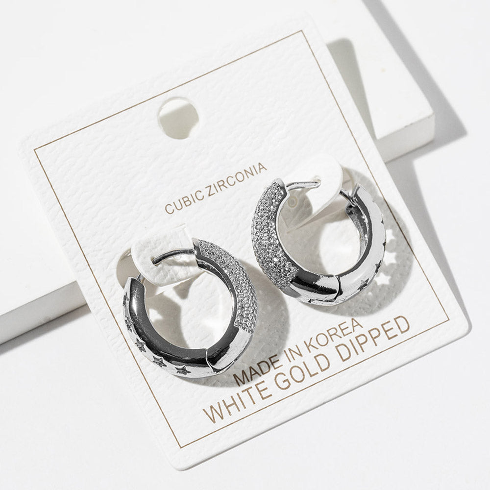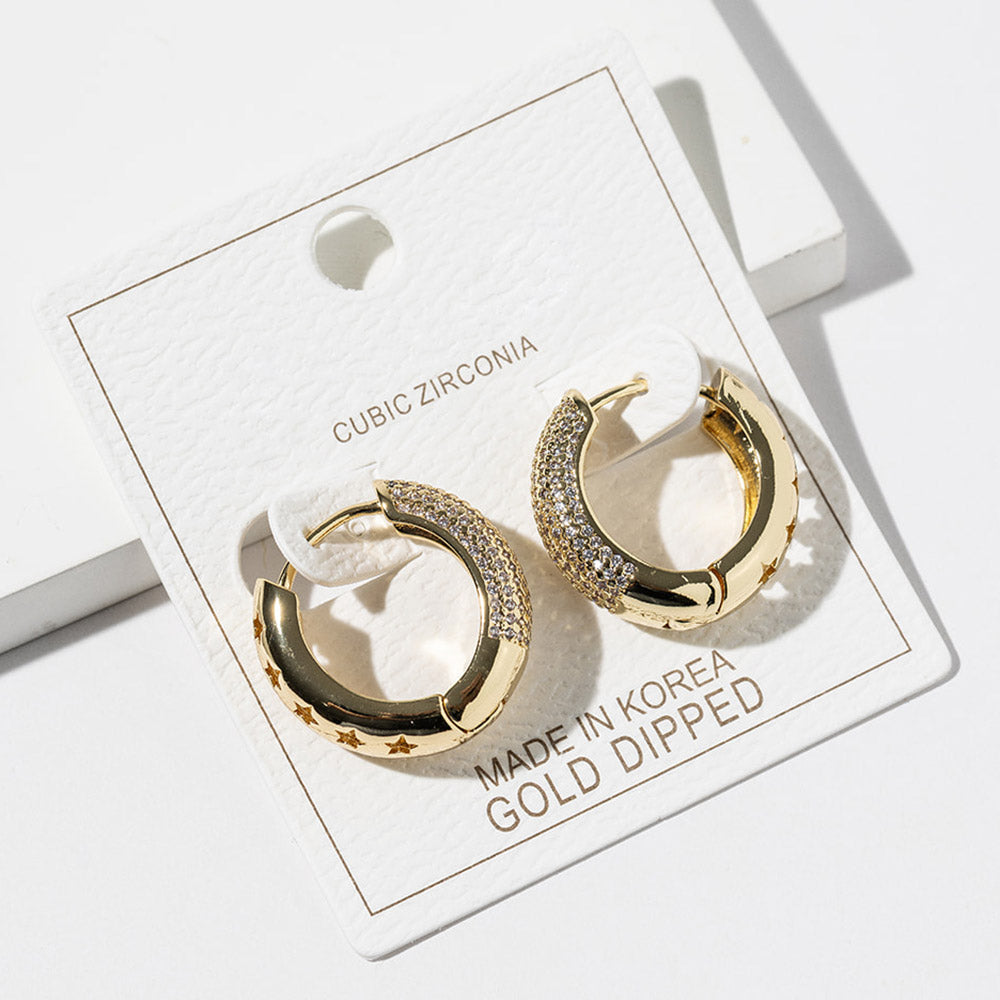 Gold dipped cubic zirconia stone paved huggie hoop earrings featuring a sleek, close-to-the-ear design with sparkling stone accents and cutout star details. Finished with a polished look and also available in white gold dipped for versatile everyday styling.