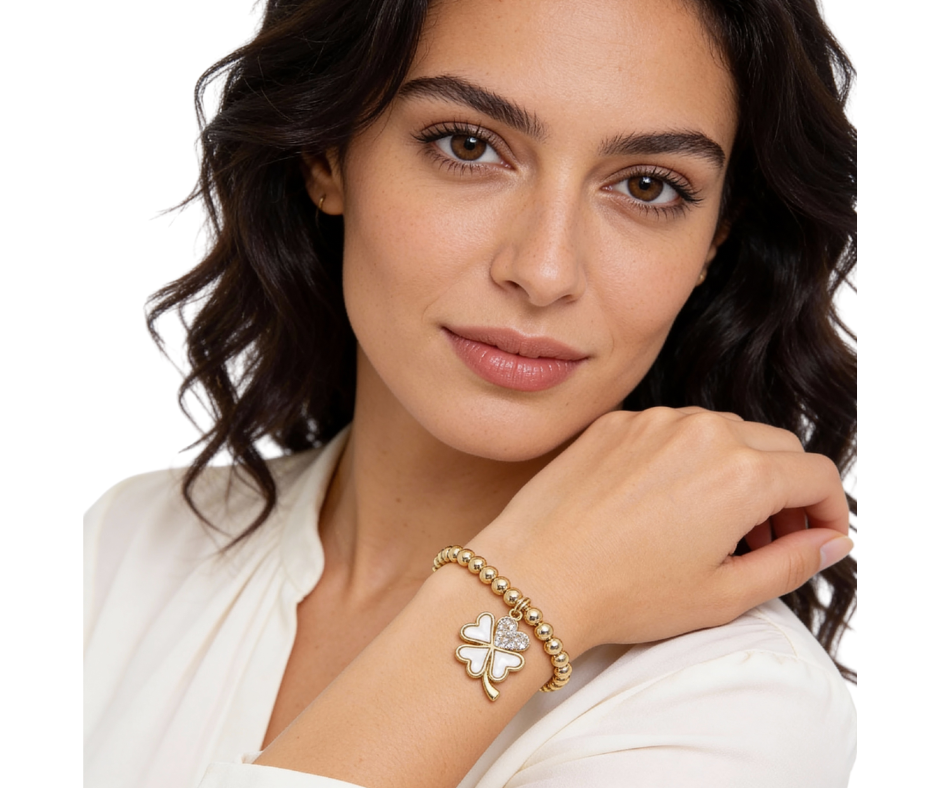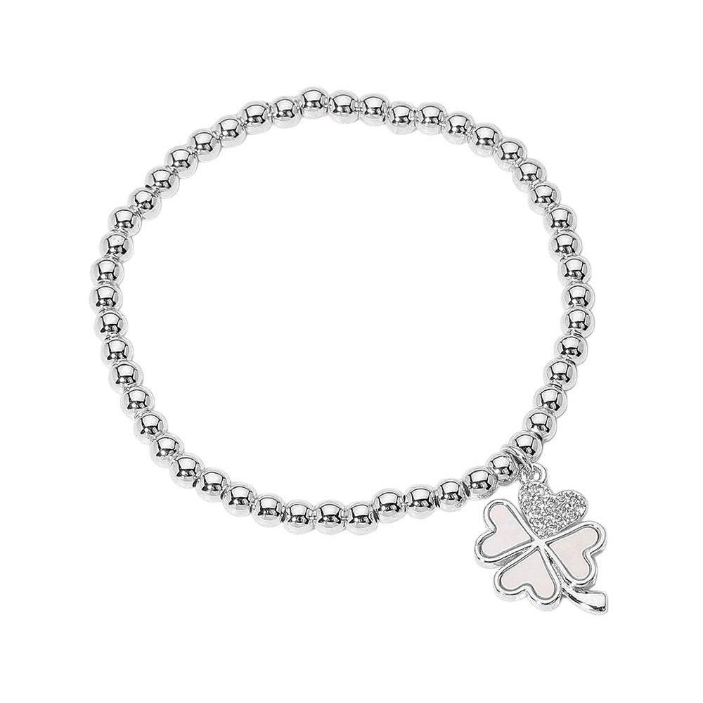 Features a polished stainless steel beaded stretch design accented with a stone-paved mother of pearl clover charm. The flexible stretch fit allows for easy, comfortable wear, making it ideal for everyday styling or layering with other bracelets. Available in gold or silver.