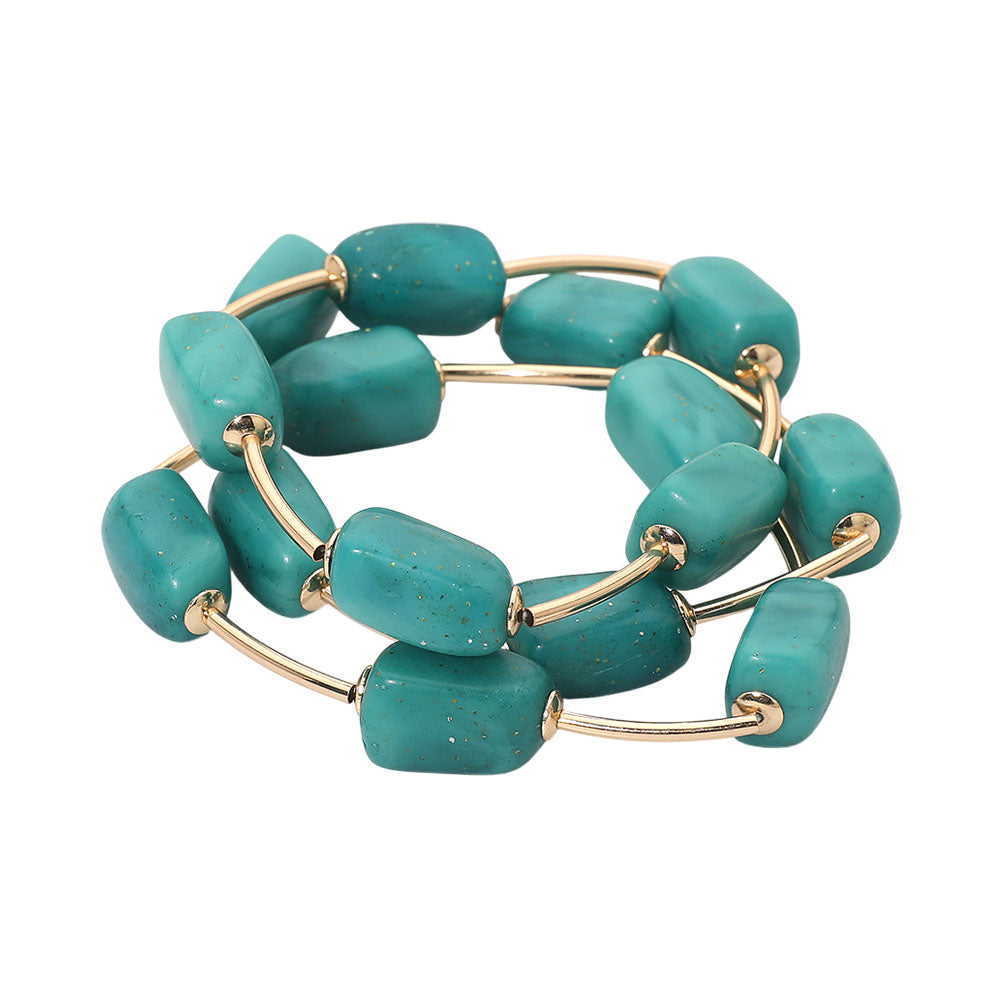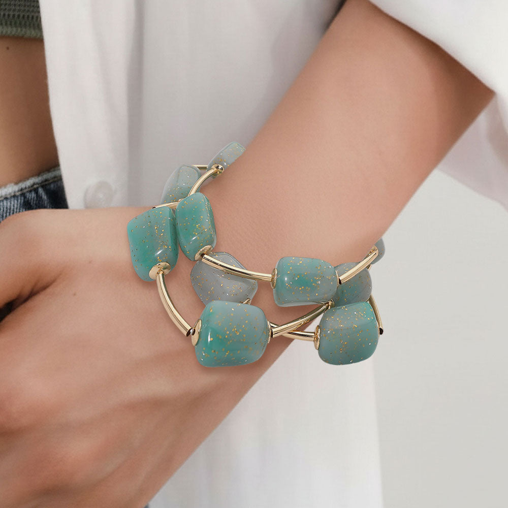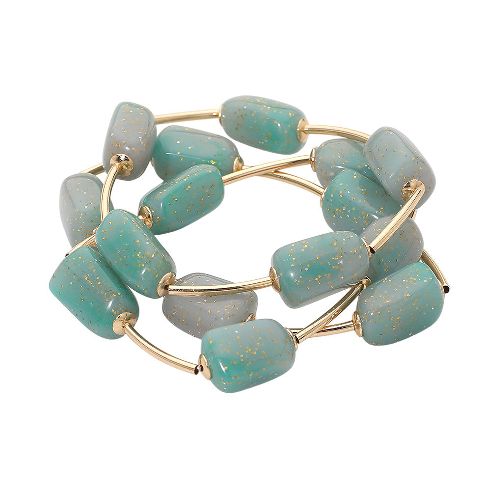 A set of three stretch bracelets featuring speckled resin pebble beads and metal bar accents in a layered design. Lightweight and easy to wear, perfect for adding texture and style to any outfit.