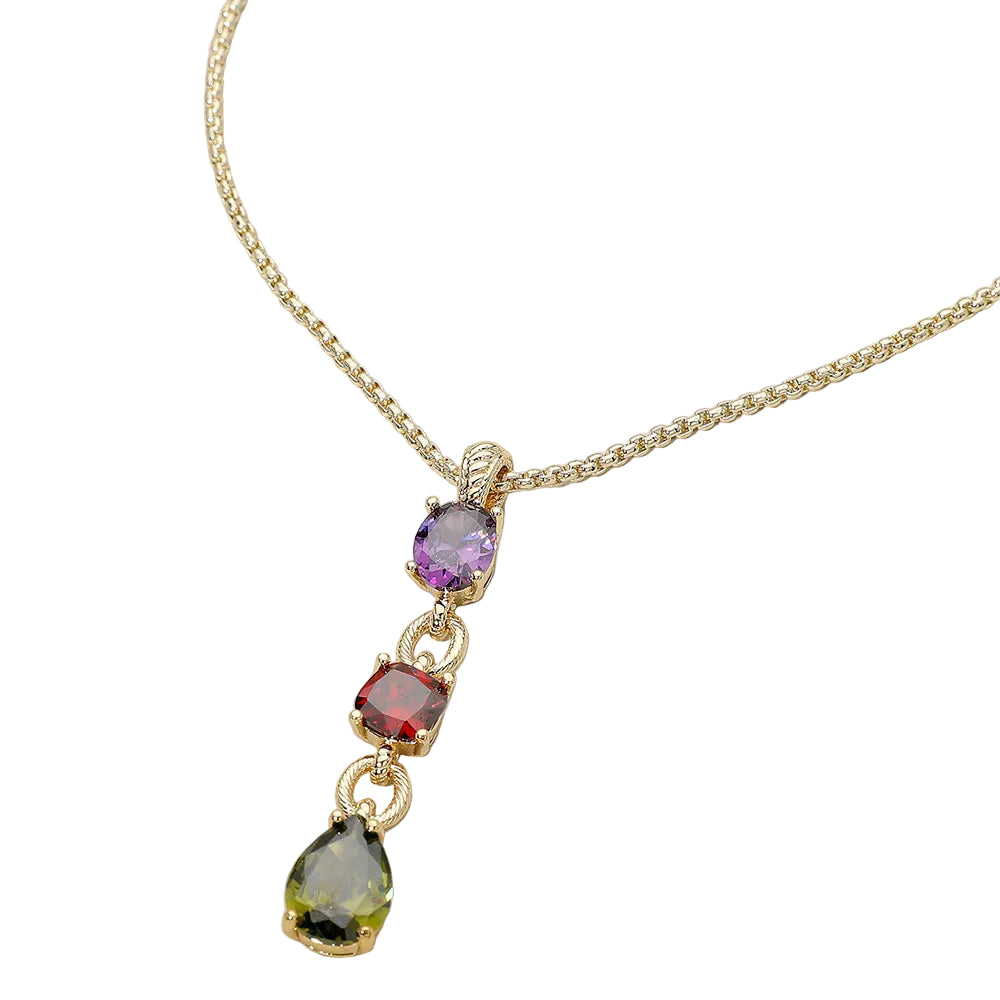A pendant necklace featuring three cubic zirconia stone drops with 14K gold plating. A stylish piece that adds subtle sparkle and a polished touch to any look.