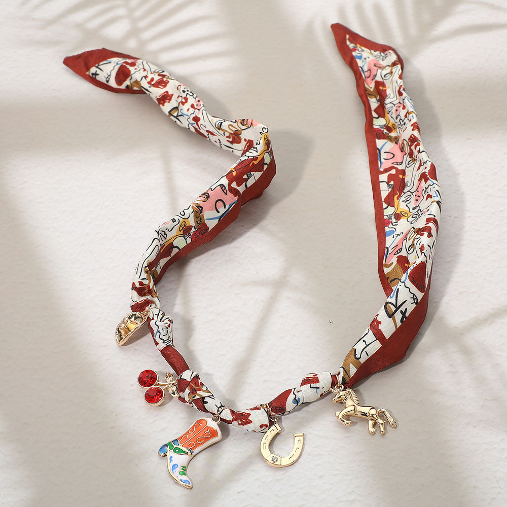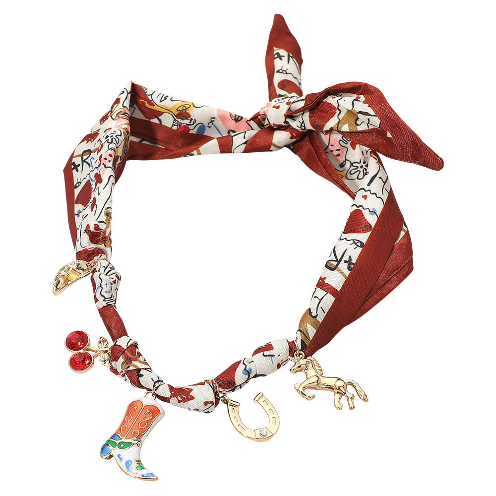 Western cowboy boot, hat, horseshoe, horse, and cherry charm station fabric scarf necklace featuring a lightweight fabric scarf accented with playful western-inspired charms. Designed to add a fun, statement touch to casual outfits with an easy, draped look.