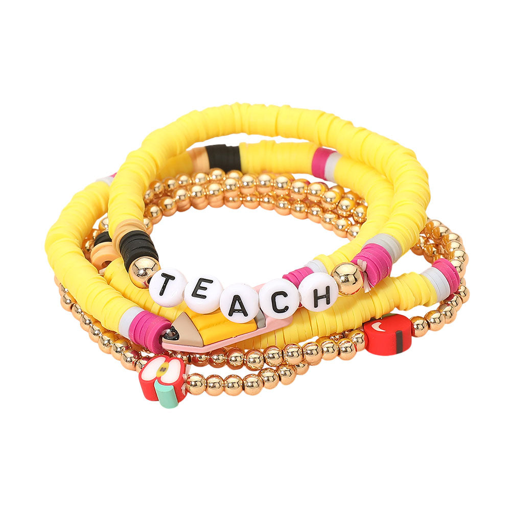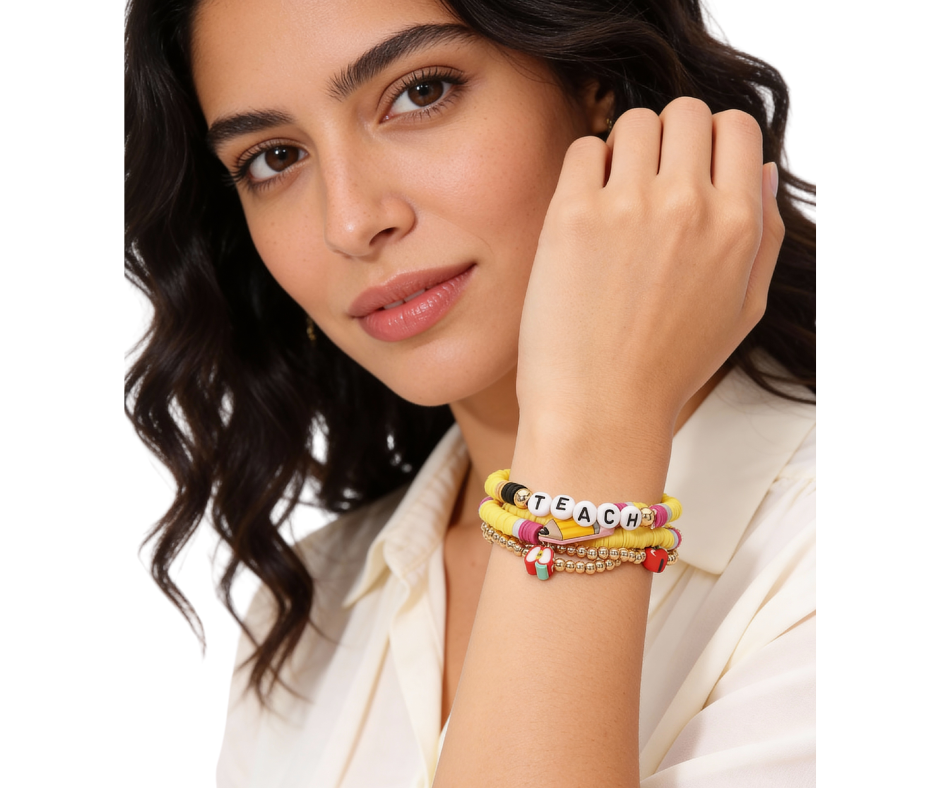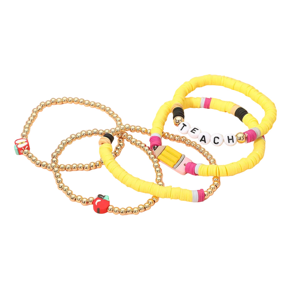 Featuring a playful mix of TEACH message charms, apple accents, metal ball beads, and heishi beads. Designed with comfortable stretch bands, this multi-piece bracelet set can be worn stacked together or mixed and matched for a fun, everyday look—perfect for showing teacher pride.
