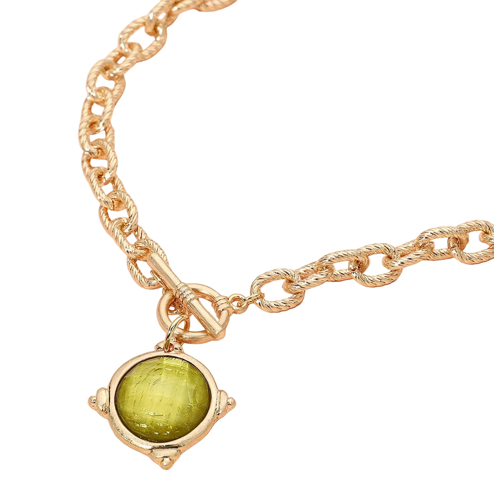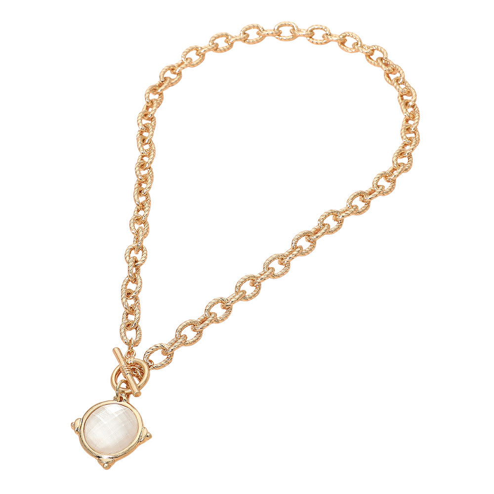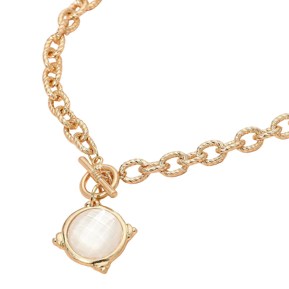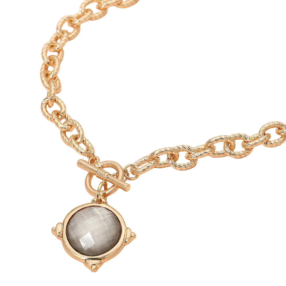 Faceted round stone charm pendant toggle necklace featuring a sparkling round stone pendant on a toggle-style chain. Lightweight and versatile, perfect for adding a touch of elegance to everyday or dressy outfits.