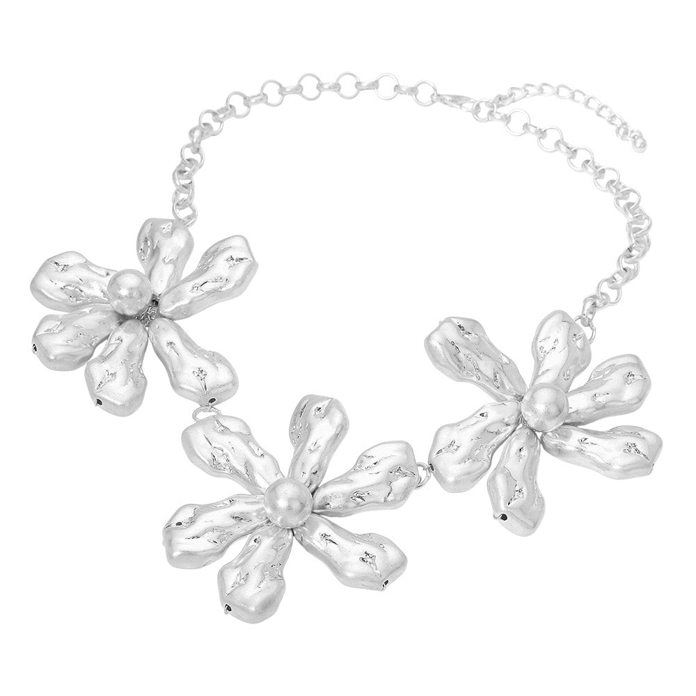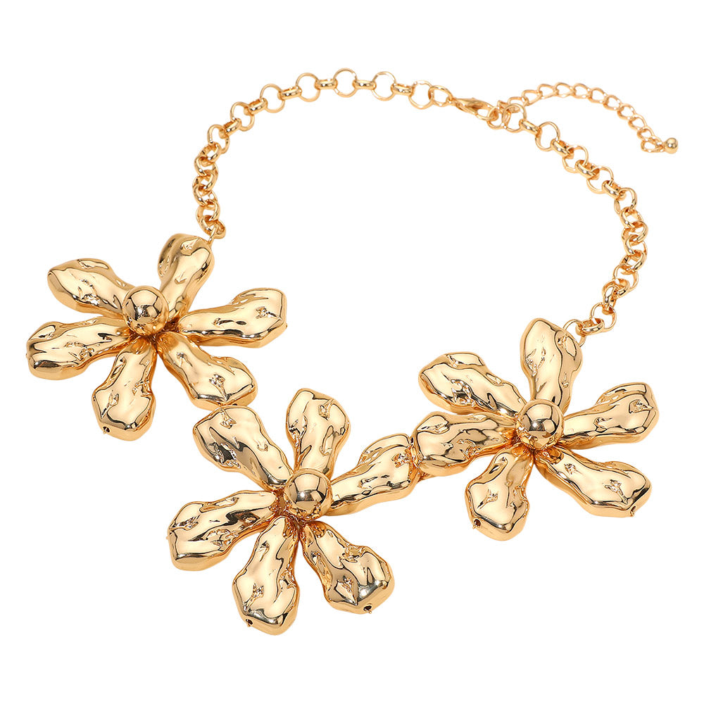 Triple puffy metal flower link statement necklace featuring three bold, textured flower-shaped links. A standout piece designed to add a playful, eye-catching touch to any outfit.
