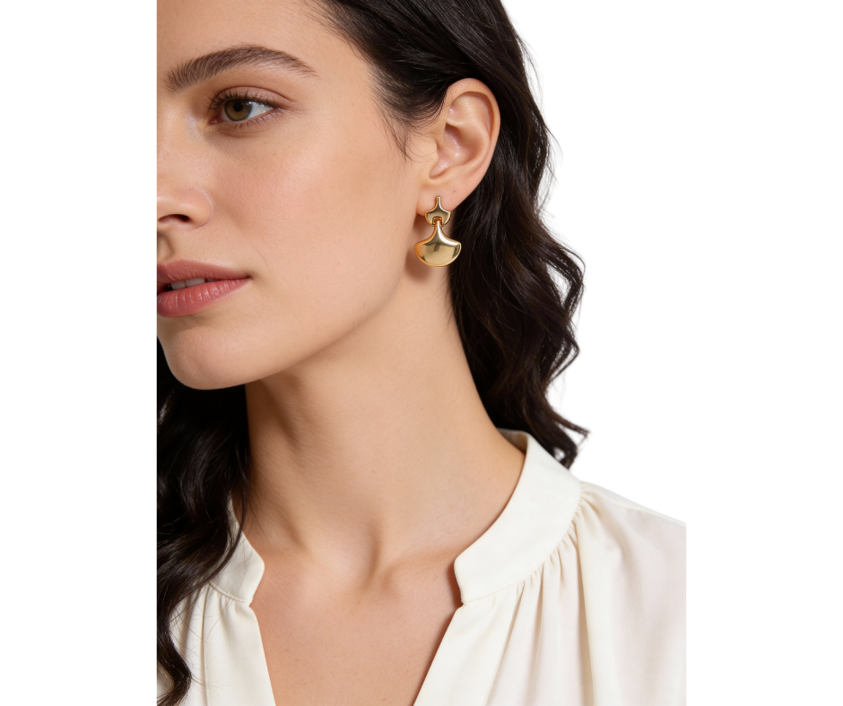 Gold dipped drop earrings featuring a modern abstract fan shape design. Lightweight with a bold look, perfect for adding a statement touch. Also available in white gold dipped.