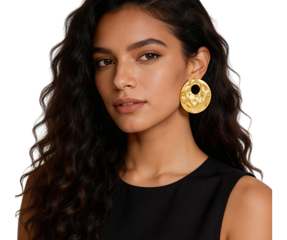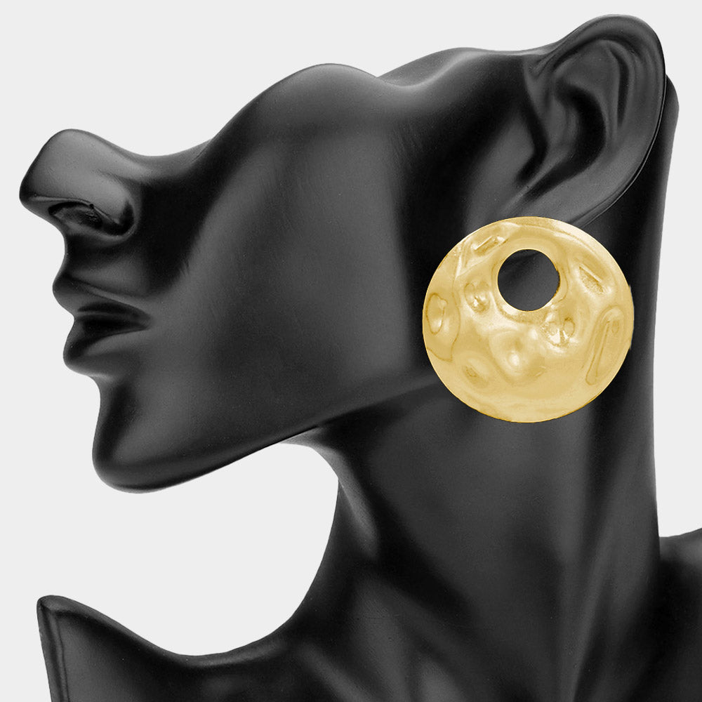 Make a bold impression with these hammered metal round statement earrings. Featuring a textured round design, these earrings add modern dimension and eye-catching style to any outfit. Perfect for everyday wear or elevating your look for special occasions.
