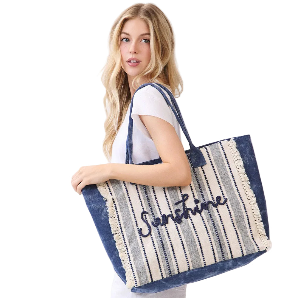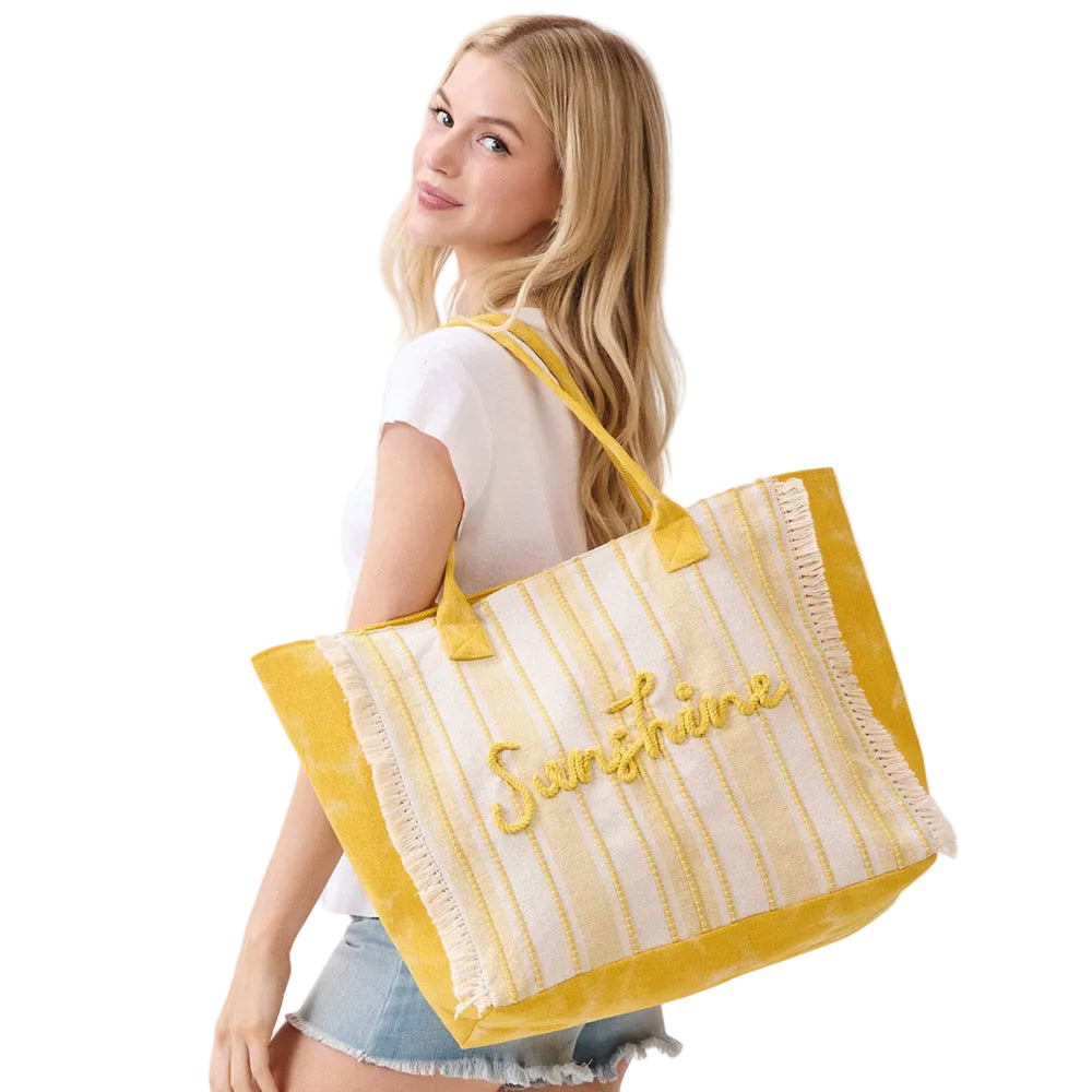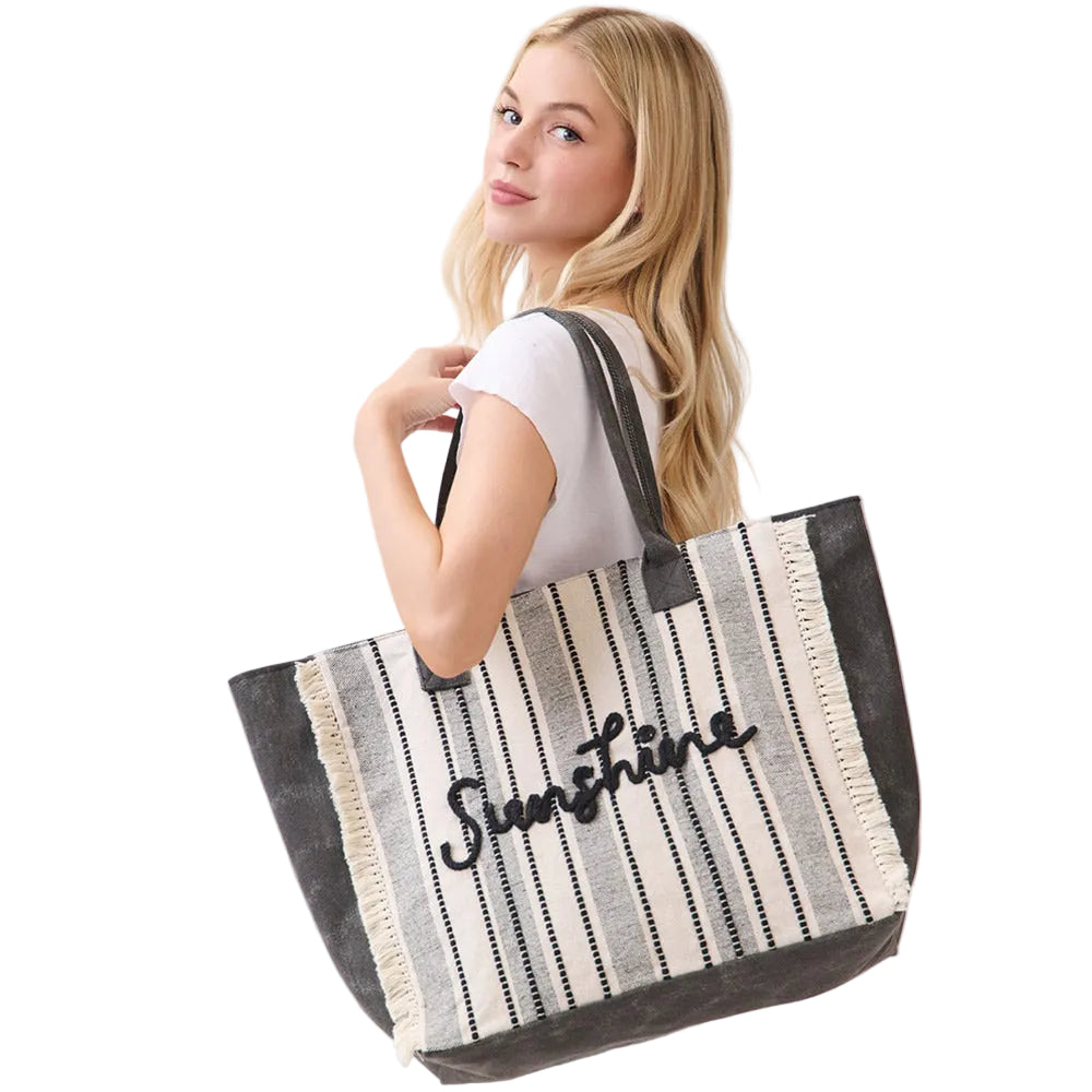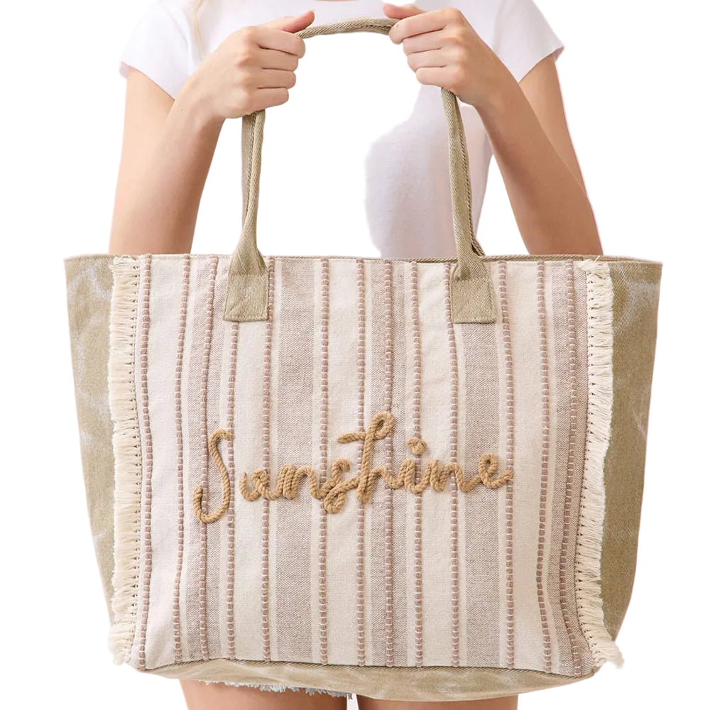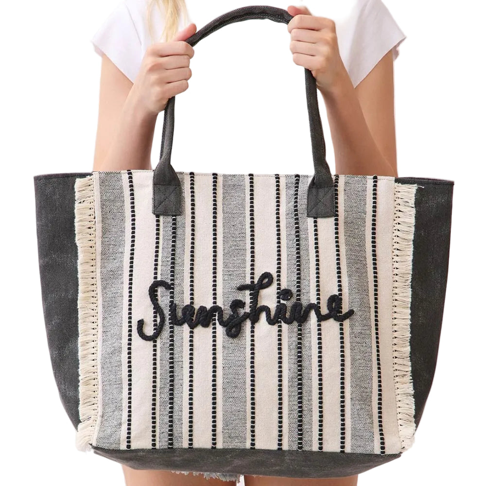 A playful striped tote featuring a bold “SUNSHINE” message and fringe trim. Spacious and lightweight, it’s perfect for beach days, weekend outings, or adding a cheerful touch to your everyday carry.