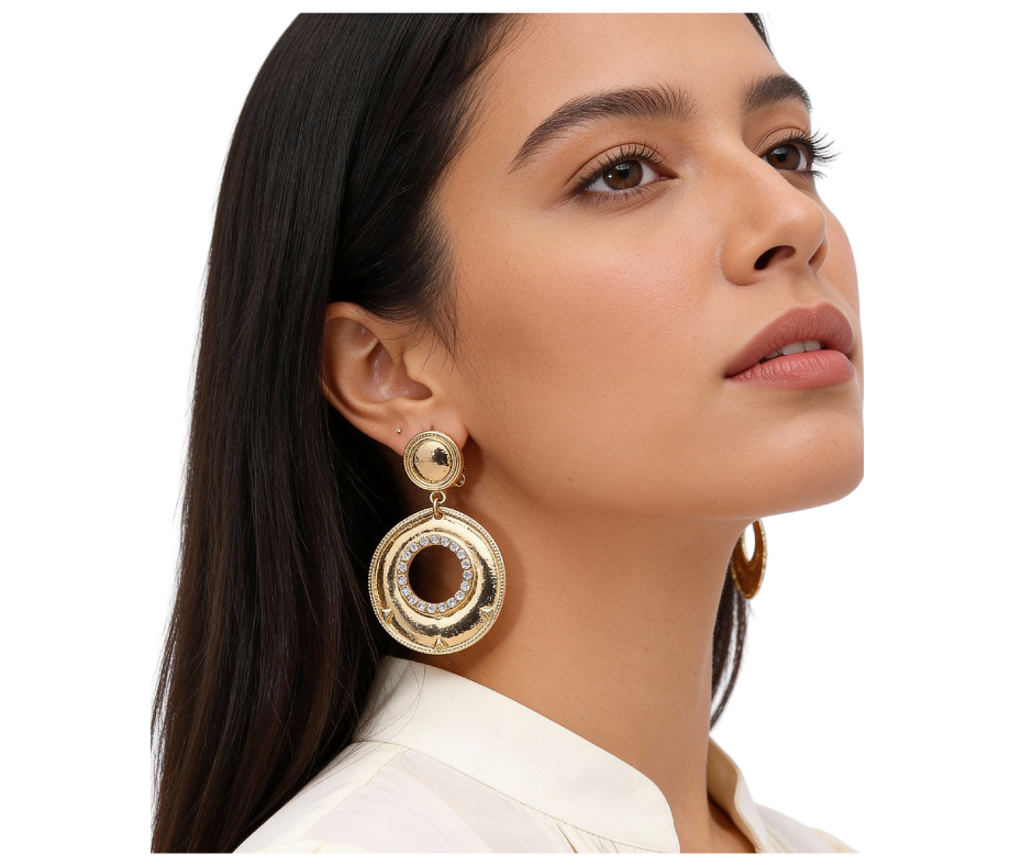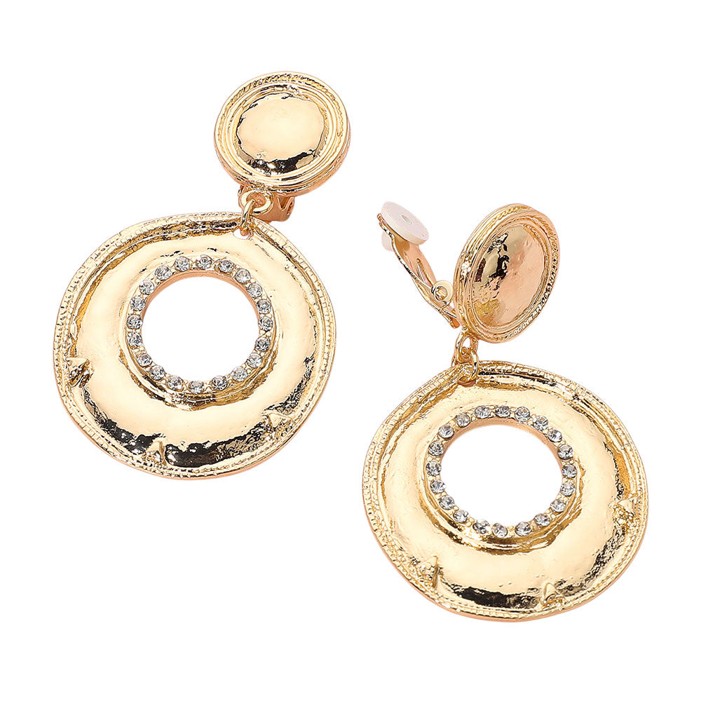 Clip-on earrings featuring textured metal ring drops accented with rhinestones. Designed for comfort and easy wear, available in gold or silver tones.