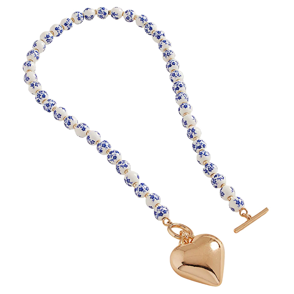 Featuring a layered design with a puffy metal heart toggle pendant, floral ceramic beads, and round accent beads along the chain. This necklace combines playful textures and shapes for a charming, statement-making look perfect for layering or wearing alone.