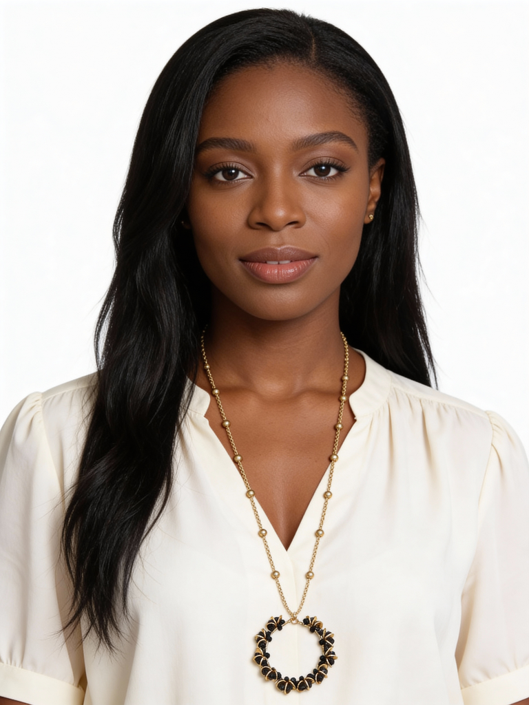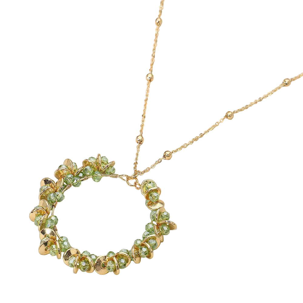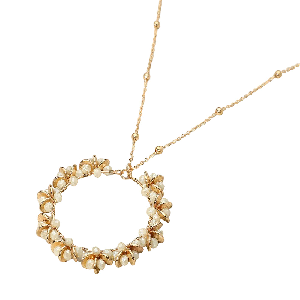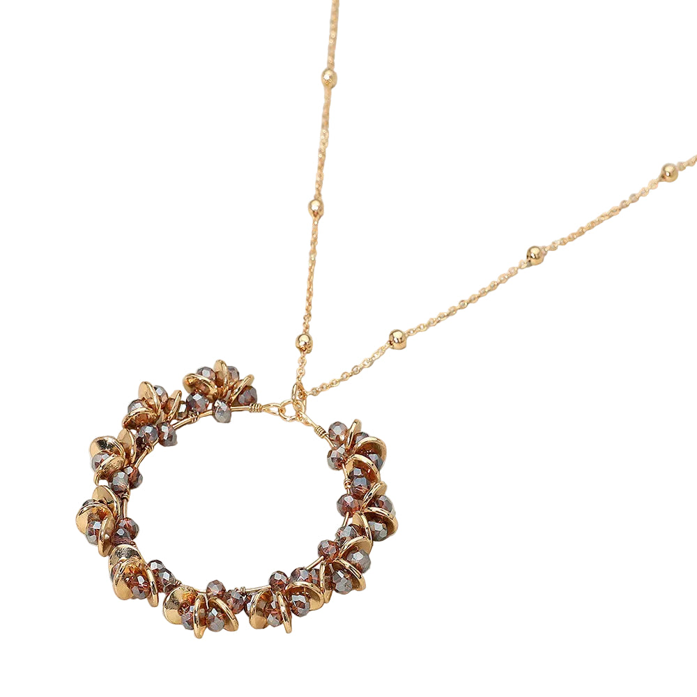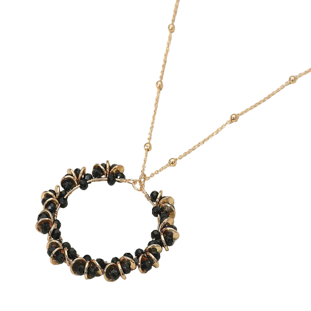 A long necklace featuring faceted beads and an open ring pendant for a modern, stylish look. Lightweight and easy to layer or wear on its own.