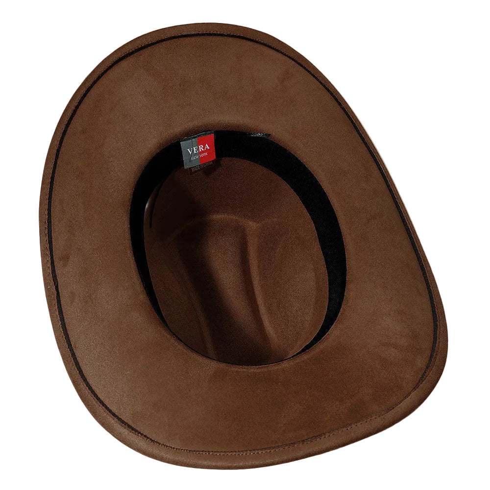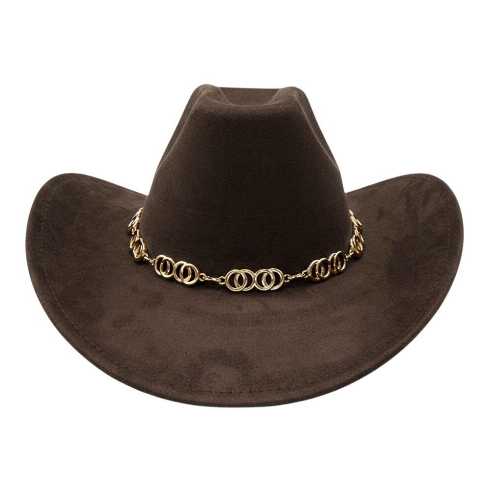 Featuring a classic cowboy fedora silhouette accented with a sleek metal chain band. Designed with a structured shape and bold detail, this hat adds a modern western edge to everyday styling.