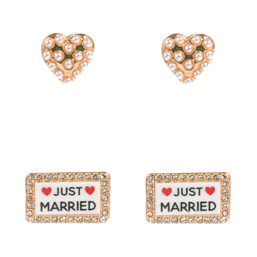 2 Pairs pearl heart JUST MARRIED sign plate stud earring set featuring playful “JUST MARRIED” sign plates paired with delicate pearl heart studs. Designed as a fun and festive accessory set, perfect for celebrating newlyweds or adding a whimsical touch to any outfit.