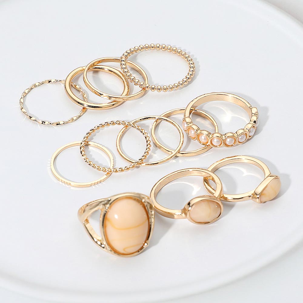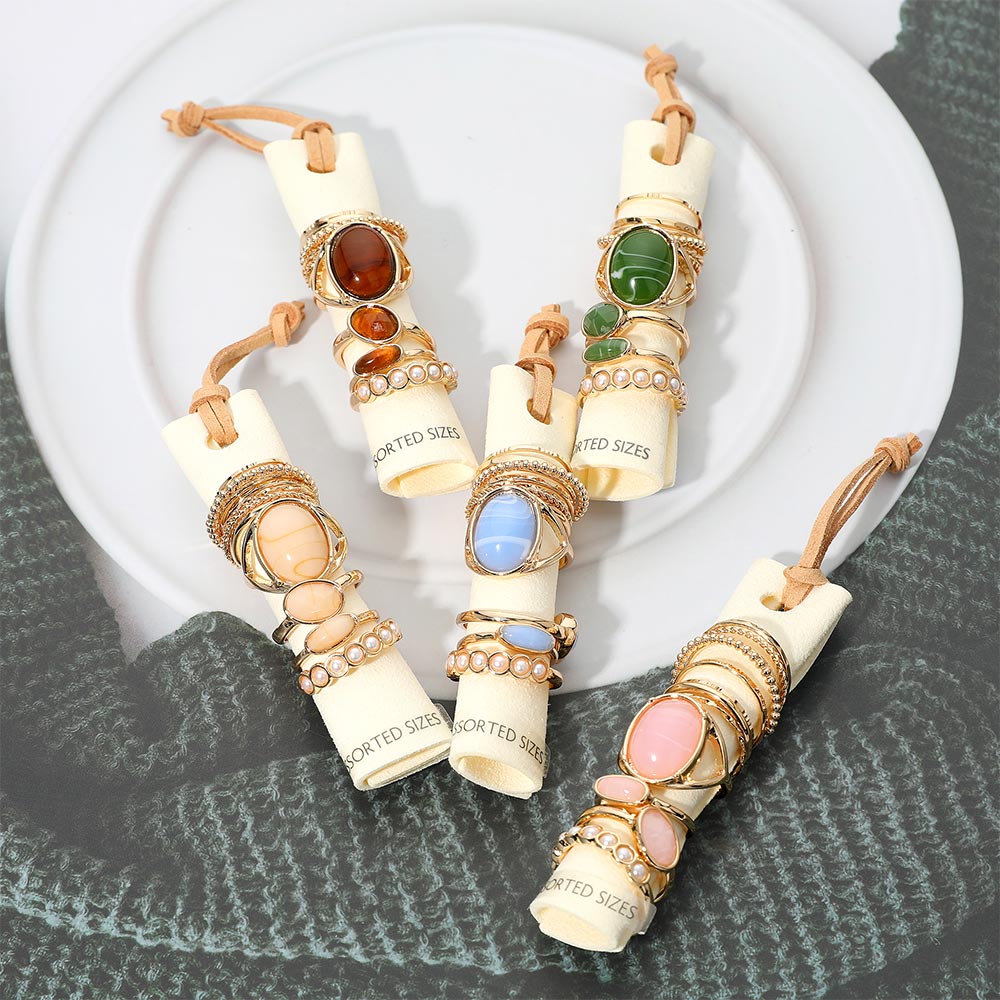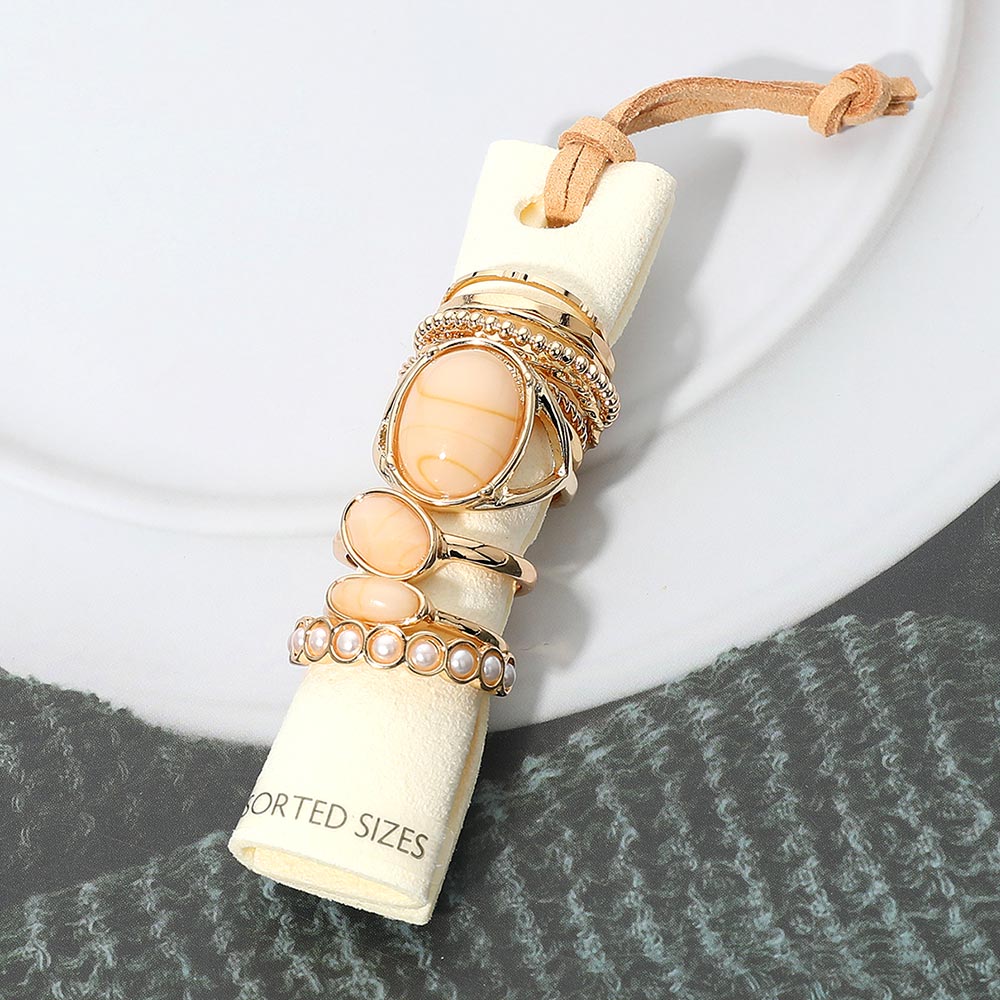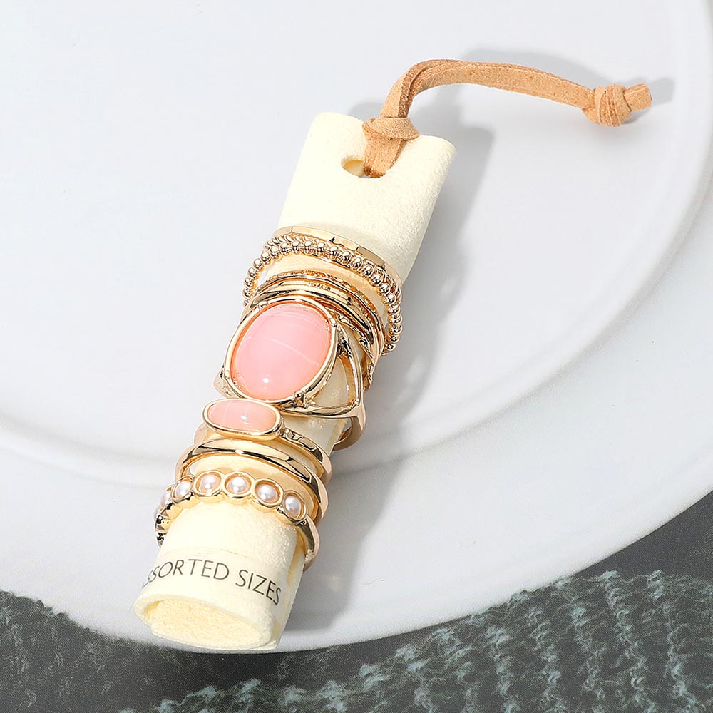 This 12-piece ring set mixes resin stone accents, pearl link details, and textured metal bands for a fun and versatile stacked look. Wear them together or mix and match to create your own style—lightweight, colorful, and easy to pair with anything.
