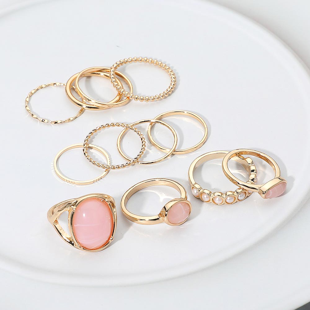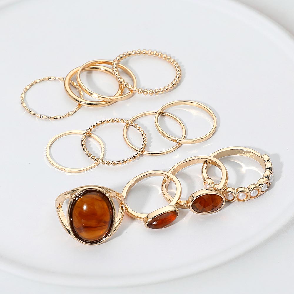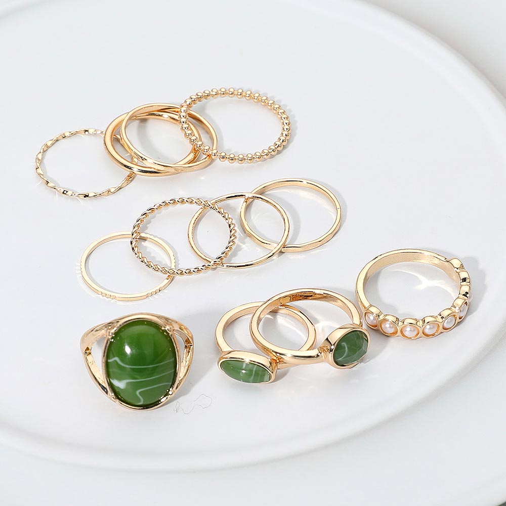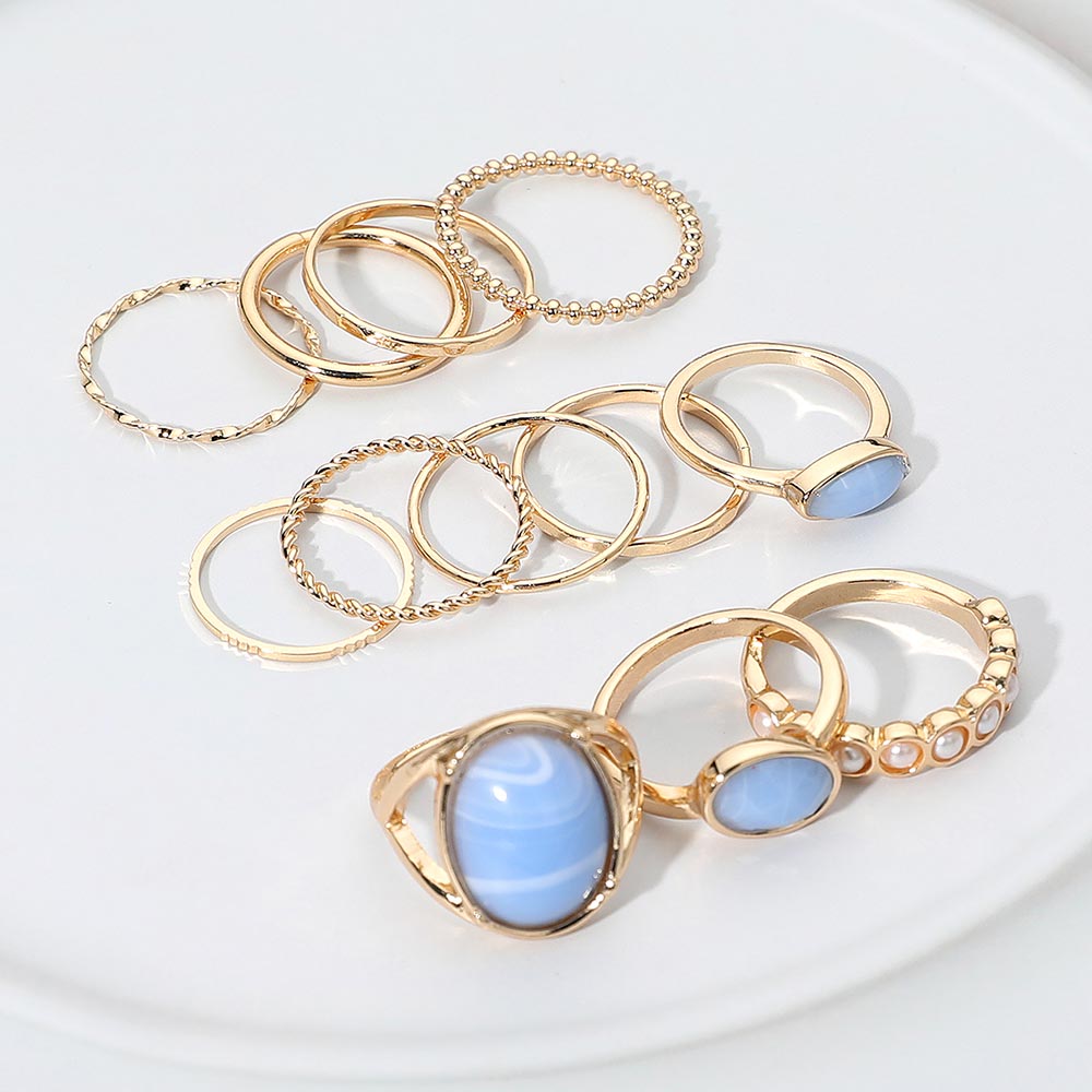 This 12-piece ring set mixes resin stone accents, pearl link details, and textured metal bands for a fun and versatile stacked look. Wear them together or mix and match to create your own style—lightweight, colorful, and easy to pair with anything.